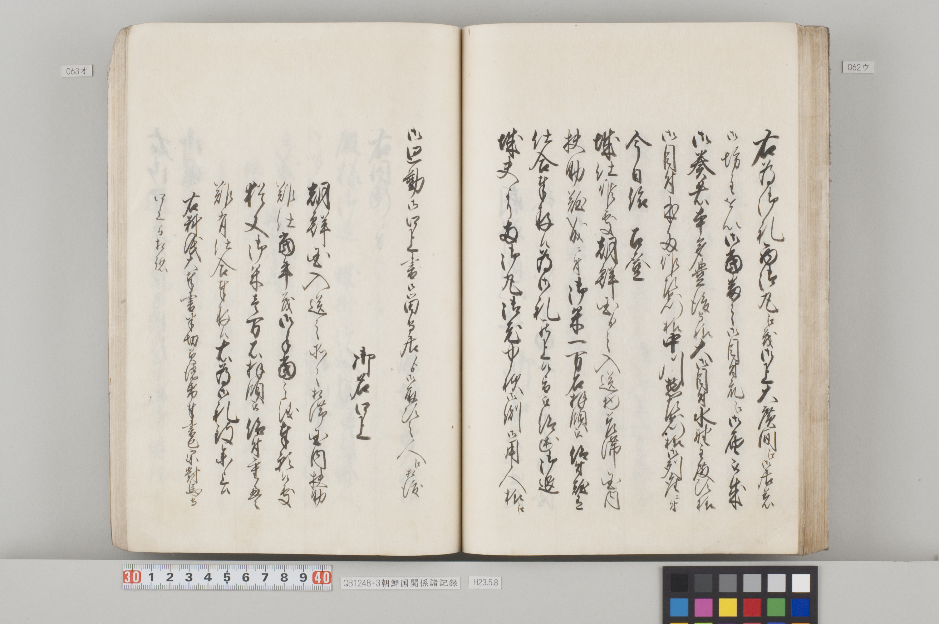 文化12年(1815)から14年にかけて、対馬藩から幕府へ出願した際の記録。3冊ある。 各冊の内容と、表紙に「表御諸札方」と書かれていることから、対馬藩の江戸藩邸で作成された記録の一部であることが分かる。 QB1248-1 全90丁の和装本。表紙には「朝鮮国飢饉ニ付米五万石買取度段、従礼曹参議以書簡懇請在之候付、公義江御拝借御願書被差出候記録」とある。 飢饉に見舞われた朝鮮国から米5万石を買い付けたいとの依頼を受けた対馬藩が、幕府に対して米の支給を出願した際の記録。文化12年3月から同年8月のことが記載されている。 巻末には朝鮮国への船賃の見積もりも記してあるが、実際に朝鮮国へ米が送られたかは、この記録からは分からない。 また、朝鮮国の倭館からの飢饉に関する詳細な報告も記載されている。 QB1248-2 全47丁の和装本。表紙には「訳官入料御願記録 丁丑四月三日御金二千両御手当被仰出」とある。 徳川家慶子竹千代死去に対する弔問の朝鮮国からの使者(訳官)を応接するための費用を援助してほしいと幕府に出願した記録。文化13年12月から同14年4月のことが記載されている。この出願により、対馬藩には2千両の手当てが支給されたことが分かる。 QB1248-3 全130丁の和装本。表紙には「朝鮮国凶年以来入送米相滞御難渋之事情依御願御米壱万石御拝領記録」とある。 対馬は朝鮮国から米を買っていたが飢饉のため米を買うことができなくなり、幕府に援助米を出願し受け取った時の記録。文化13年5月から同14年3月のことが記載されている。 巻末には、延享3年(1746)以降の幕府からの援助の記録や、今回の出願に際して尽力した幕府役人への御礼の目録も収録してある。 なお『徳川実紀』によれば、対馬藩は文化12年7月にも幕府より1万石を拝領している。