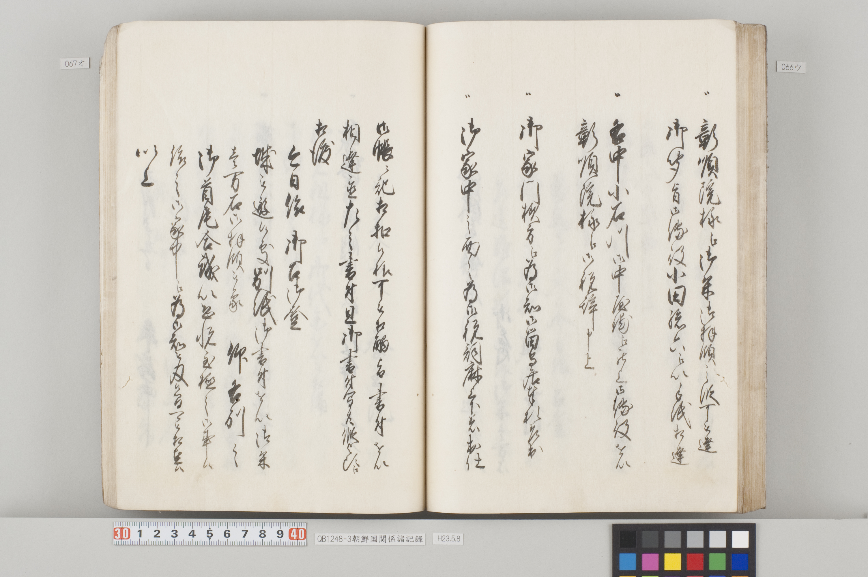文化12年(1815)から14年にかけて、対馬藩から幕府へ出願した際の記録。3冊ある。 各冊の内容と、表紙に「表御諸札方」と書かれていることから、対馬藩の江戸藩邸で作成された記録の一部であることが分かる。 QB1248-1 全90丁の和装本。表紙には「朝鮮国飢饉ニ付米五万石買取度段、従礼曹参議以書簡懇請在之候付、公義江御拝借御願書被差出候記録」とある。 飢饉に見舞われた朝鮮国から米5万石を買い付けたいとの依頼を受けた対馬藩が、幕府に対して米の支給を出願した際の記録。文化12年3月から同年8月のことが記載されている。 巻末には朝鮮国への船賃の見積もりも記してあるが、実際に朝鮮国へ米が送られたかは、この記録からは分からない。 また、朝鮮国の倭館からの飢饉に関する詳細な報告も記載されている。 QB1248-2 全47丁の和装本。表紙には「訳官入料御願記録 丁丑四月三日御金二千両御手当被仰出」とある。 徳川家慶子竹千代死去に対する弔問の朝鮮国からの使者(訳官)を応接するための費用を援助してほしいと幕府に出願した記録。文化13年12月から同14年4月のことが記載されている。この出願により、対馬藩には2千両の手当てが支給されたことが分かる。 QB1248-3 全130丁の和装本。表紙には「朝鮮国凶年以来入送米相滞御難渋之事情依御願御米壱万石御拝領記録」とある。 対馬は朝鮮国から米を買っていたが飢饉のため米を買うことができなくなり、幕府に援助米を出願し受け取った時の記録。文化13年5月から同14年3月のことが記載されている。 巻末には、延享3年(1746)以降の幕府からの援助の記録や、今回の出願に際して尽力した幕府役人への御礼の目録も収録してある。 なお『徳川実紀』によれば、対馬藩は文化12年7月にも幕府より1万石を拝領している。