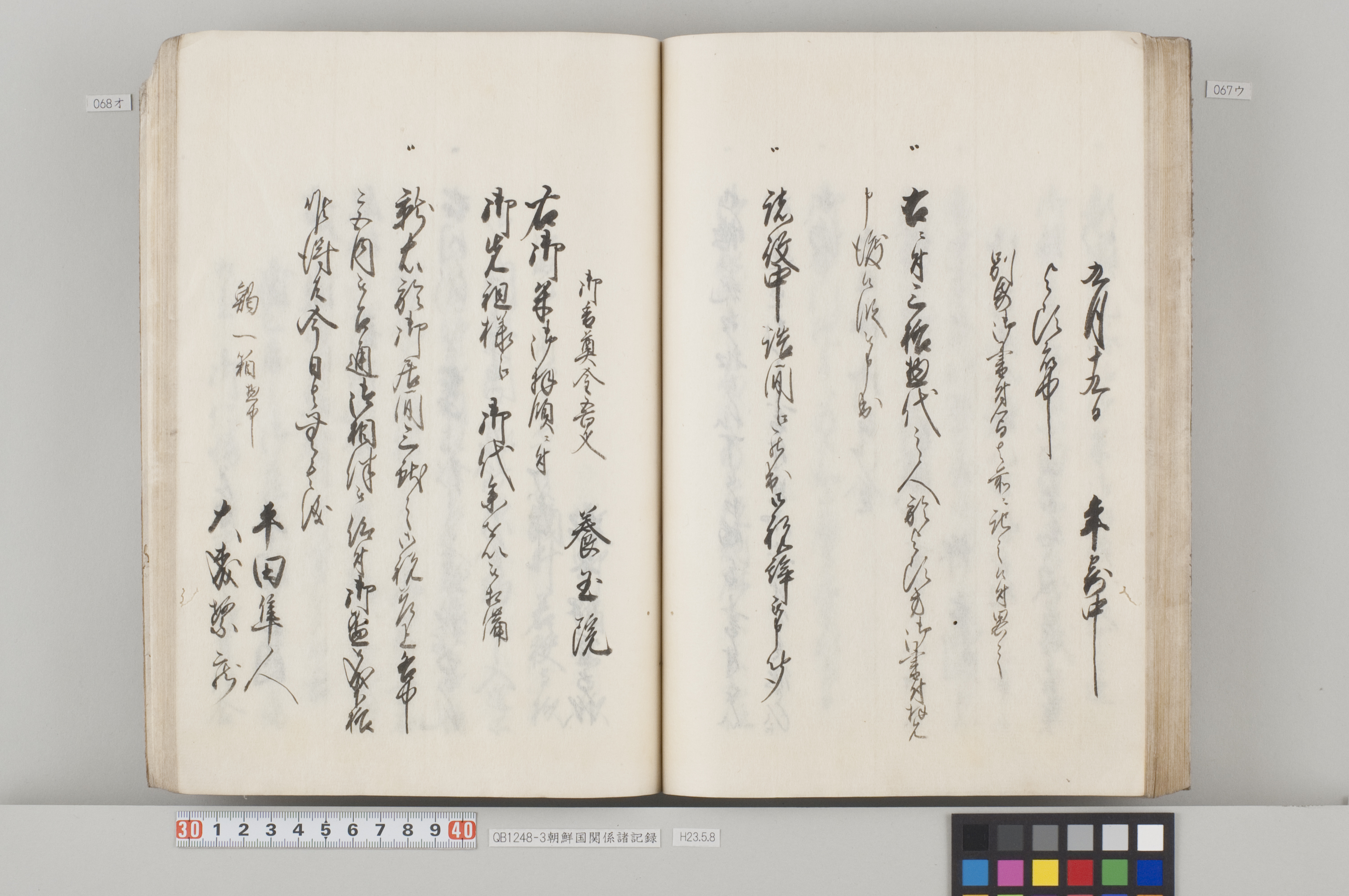 文化12年(1815)から14年にかけて、対馬藩から幕府へ出願した際の記録。3冊ある。 各冊の内容と、表紙に「表御諸札方」と書かれていることから、対馬藩の江戸藩邸で作成された記録の一部であることが分かる。 QB1248-1 全90丁の和装本。表紙には「朝鮮国飢饉ニ付米五万石買取度段、従礼曹参議以書簡懇請在之候付、公義江御拝借御願書被差出候記録」とある。 飢饉に見舞われた朝鮮国から米5万石を買い付けたいとの依頼を受けた対馬藩が、幕府に対して米の支給を出願した際の記録。文化12年3月から同年8月のことが記載されている。 巻末には朝鮮国への船賃の見積もりも記してあるが、実際に朝鮮国へ米が送られたかは、この記録からは分からない。 また、朝鮮国の倭館からの飢饉に関する詳細な報告も記載されている。 QB1248-2 全47丁の和装本。表紙には「訳官入料御願記録 丁丑四月三日御金二千両御手当被仰出」とある。 徳川家慶子竹千代死去に対する弔問の朝鮮国からの使者(訳官)を応接するための費用を援助してほしいと幕府に出願した記録。文化13年12月から同14年4月のことが記載されている。この出願により、対馬藩には2千両の手当てが支給されたことが分かる。 QB1248-3 全130丁の和装本。表紙には「朝鮮国凶年以来入送米相滞御難渋之事情依御願御米壱万石御拝領記録」とある。 対馬は朝鮮国から米を買っていたが飢饉のため米を買うことができなくなり、幕府に援助米を出願し受け取った時の記録。文化13年5月から同14年3月のことが記載されている。 巻末には、延享3年(1746)以降の幕府からの援助の記録や、今回の出願に際して尽力した幕府役人への御礼の目録も収録してある。 なお『徳川実紀』によれば、対馬藩は文化12年7月にも幕府より1万石を拝領している。