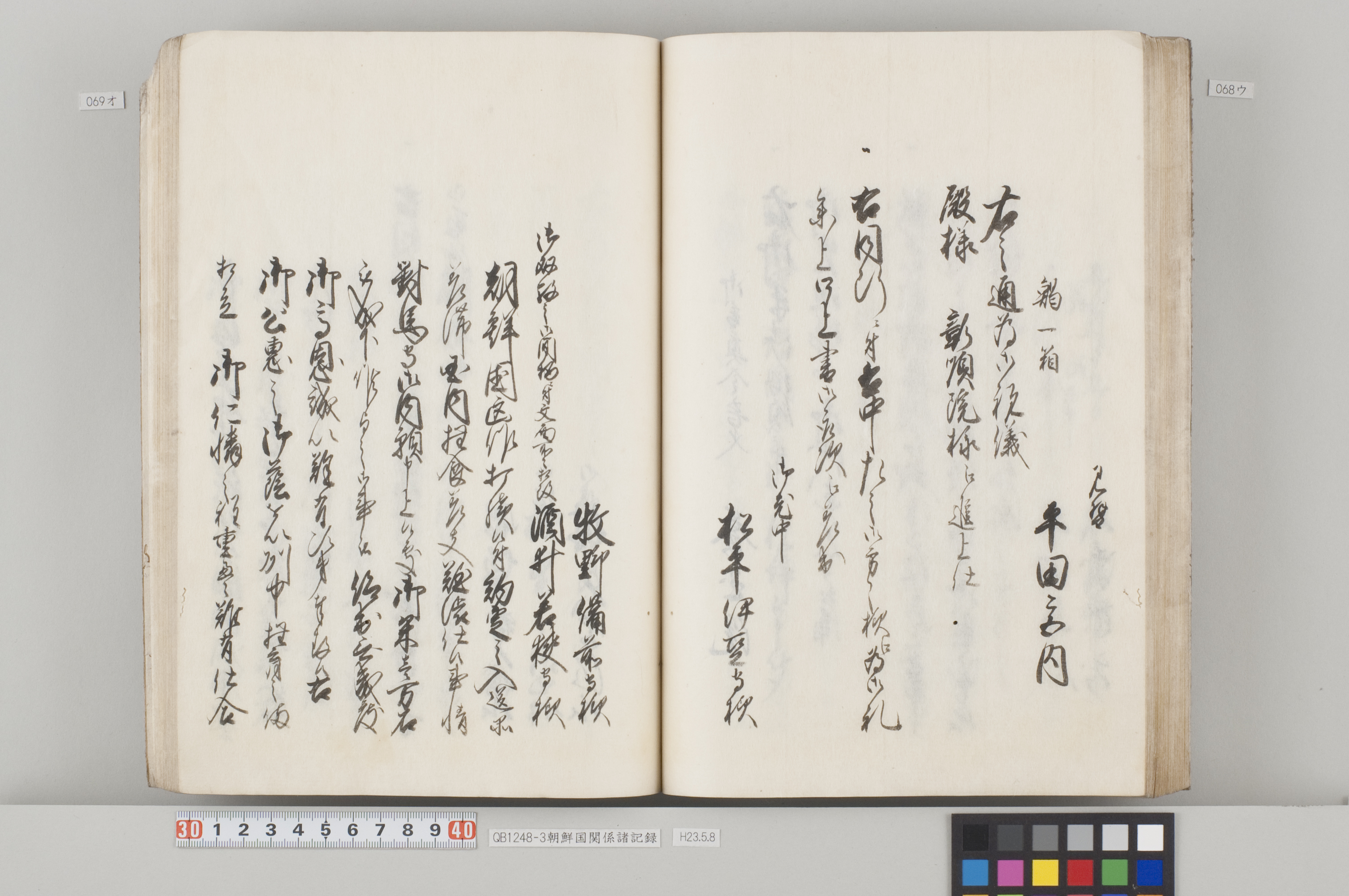 文化12年(1815)から14年にかけて、対馬藩から幕府へ出願した際の記録。3冊ある。 各冊の内容と、表紙に「表御諸札方」と書かれていることから、対馬藩の江戸藩邸で作成された記録の一部であることが分かる。 QB1248-1 全90丁の和装本。表紙には「朝鮮国飢饉ニ付米五万石買取度段、従礼曹参議以書簡懇請在之候付、公義江御拝借御願書被差出候記録」とある。 飢饉に見舞われた朝鮮国から米5万石を買い付けたいとの依頼を受けた対馬藩が、幕府に対して米の支給を出願した際の記録。文化12年3月から同年8月のことが記載されている。 巻末には朝鮮国への船賃の見積もりも記してあるが、実際に朝鮮国へ米が送られたかは、この記録からは分からない。 また、朝鮮国の倭館からの飢饉に関する詳細な報告も記載されている。 QB1248-2 全47丁の和装本。表紙には「訳官入料御願記録 丁丑四月三日御金二千両御手当被仰出」とある。 徳川家慶子竹千代死去に対する弔問の朝鮮国からの使者(訳官)を応接するための費用を援助してほしいと幕府に出願した記録。文化13年12月から同14年4月のことが記載されている。この出願により、対馬藩には2千両の手当てが支給されたことが分かる。 QB1248-3 全130丁の和装本。表紙には「朝鮮国凶年以来入送米相滞御難渋之事情依御願御米壱万石御拝領記録」とある。 対馬は朝鮮国から米を買っていたが飢饉のため米を買うことができなくなり、幕府に援助米を出願し受け取った時の記録。文化13年5月から同14年3月のことが記載されている。 巻末には、延享3年(1746)以降の幕府からの援助の記録や、今回の出願に際して尽力した幕府役人への御礼の目録も収録してある。 なお『徳川実紀』によれば、対馬藩は文化12年7月にも幕府より1万石を拝領している。