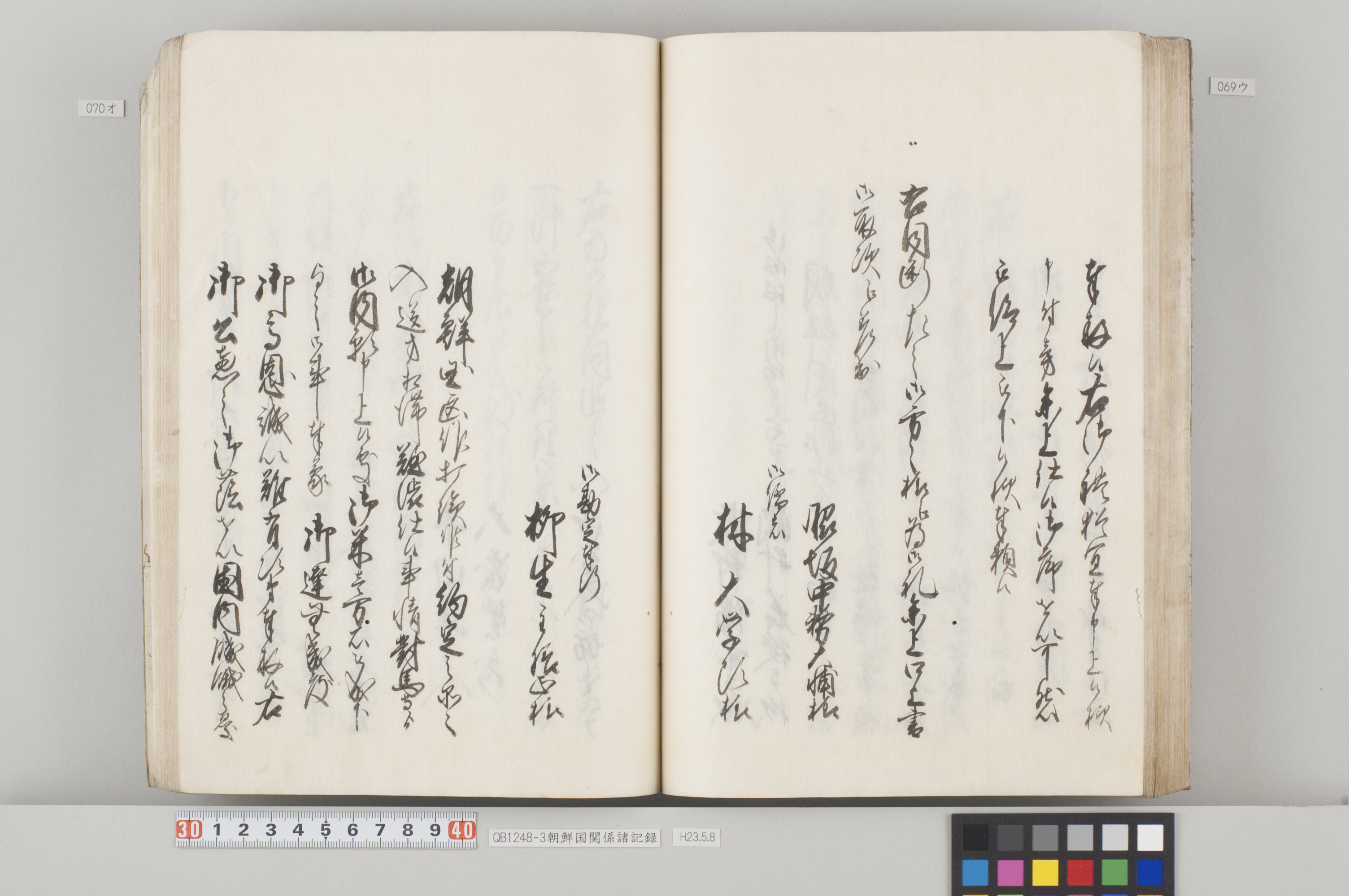 文化12年(1815)から14年にかけて、対馬藩から幕府へ出願した際の記録。3冊ある。 各冊の内容と、表紙に「表御諸札方」と書かれていることから、対馬藩の江戸藩邸で作成された記録の一部であることが分かる。 QB1248-1 全90丁の和装本。表紙には「朝鮮国飢饉ニ付米五万石買取度段、従礼曹参議以書簡懇請在之候付、公義江御拝借御願書被差出候記録」とある。 飢饉に見舞われた朝鮮国から米5万石を買い付けたいとの依頼を受けた対馬藩が、幕府に対して米の支給を出願した際の記録。文化12年3月から同年8月のことが記載されている。 巻末には朝鮮国への船賃の見積もりも記してあるが、実際に朝鮮国へ米が送られたかは、この記録からは分からない。 また、朝鮮国の倭館からの飢饉に関する詳細な報告も記載されている。 QB1248-2 全47丁の和装本。表紙には「訳官入料御願記録 丁丑四月三日御金二千両御手当被仰出」とある。 徳川家慶子竹千代死去に対する弔問の朝鮮国からの使者(訳官)を応接するための費用を援助してほしいと幕府に出願した記録。文化13年12月から同14年4月のことが記載されている。この出願により、対馬藩には2千両の手当てが支給されたことが分かる。 QB1248-3 全130丁の和装本。表紙には「朝鮮国凶年以来入送米相滞御難渋之事情依御願御米壱万石御拝領記録」とある。 対馬は朝鮮国から米を買っていたが飢饉のため米を買うことができなくなり、幕府に援助米を出願し受け取った時の記録。文化13年5月から同14年3月のことが記載されている。 巻末には、延享3年(1746)以降の幕府からの援助の記録や、今回の出願に際して尽力した幕府役人への御礼の目録も収録してある。 なお『徳川実紀』によれば、対馬藩は文化12年7月にも幕府より1万石を拝領している。
