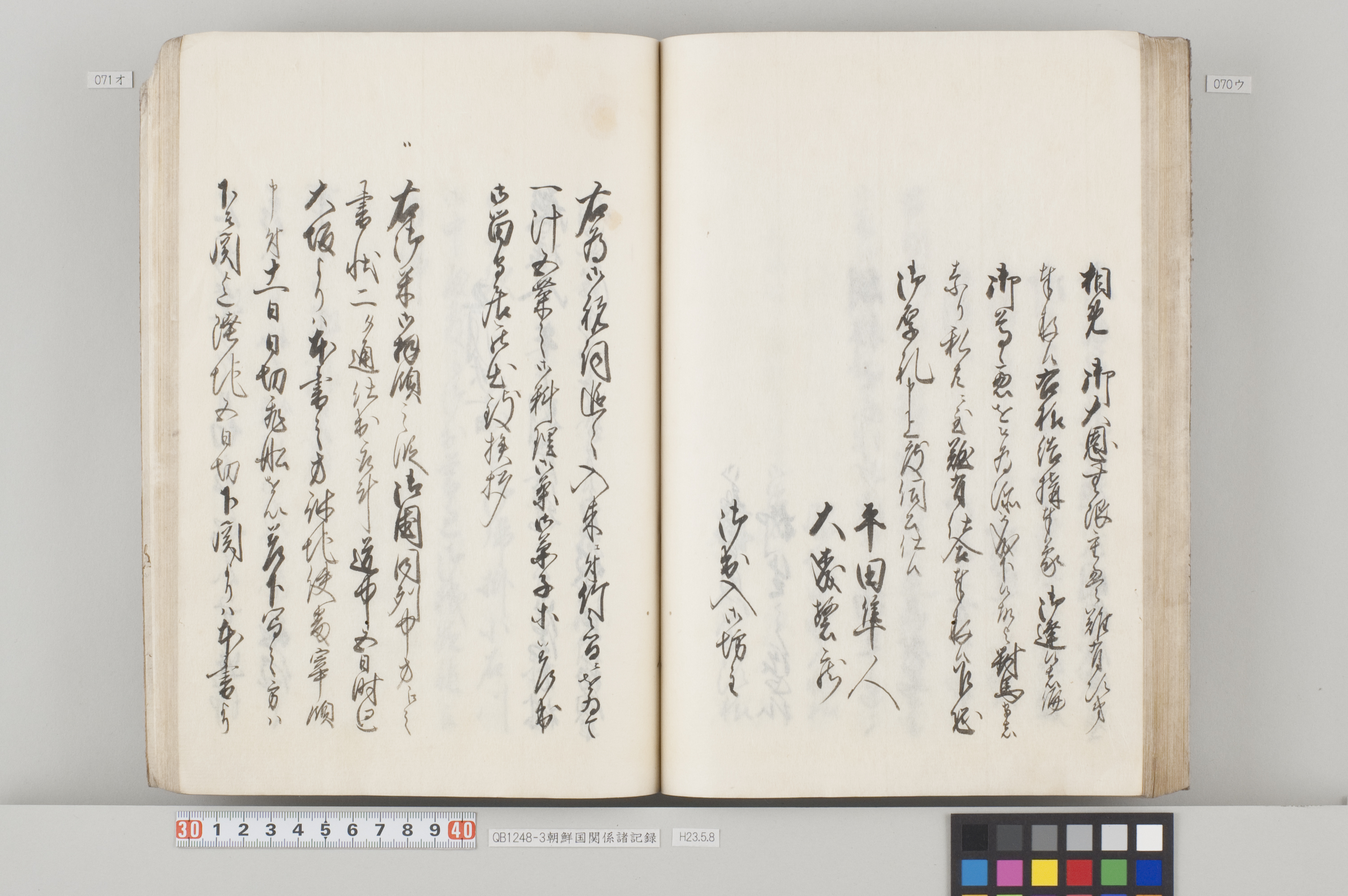 文化12年(1815)から14年にかけて、対馬藩から幕府へ出願した際の記録。3冊ある。 各冊の内容と、表紙に「表御諸札方」と書かれていることから、対馬藩の江戸藩邸で作成された記録の一部であることが分かる。 QB1248-1 全90丁の和装本。表紙には「朝鮮国飢饉ニ付米五万石買取度段、従礼曹参議以書簡懇請在之候付、公義江御拝借御願書被差出候記録」とある。 飢饉に見舞われた朝鮮国から米5万石を買い付けたいとの依頼を受けた対馬藩が、幕府に対して米の支給を出願した際の記録。文化12年3月から同年8月のことが記載されている。 巻末には朝鮮国への船賃の見積もりも記してあるが、実際に朝鮮国へ米が送られたかは、この記録からは分からない。 また、朝鮮国の倭館からの飢饉に関する詳細な報告も記載されている。 QB1248-2 全47丁の和装本。表紙には「訳官入料御願記録 丁丑四月三日御金二千両御手当被仰出」とある。 徳川家慶子竹千代死去に対する弔問の朝鮮国からの使者(訳官)を応接するための費用を援助してほしいと幕府に出願した記録。文化13年12月から同14年4月のことが記載されている。この出願により、対馬藩には2千両の手当てが支給されたことが分かる。 QB1248-3 全130丁の和装本。表紙には「朝鮮国凶年以来入送米相滞御難渋之事情依御願御米壱万石御拝領記録」とある。 対馬は朝鮮国から米を買っていたが飢饉のため米を買うことができなくなり、幕府に援助米を出願し受け取った時の記録。文化13年5月から同14年3月のことが記載されている。 巻末には、延享3年(1746)以降の幕府からの援助の記録や、今回の出願に際して尽力した幕府役人への御礼の目録も収録してある。 なお『徳川実紀』によれば、対馬藩は文化12年7月にも幕府より1万石を拝領している。
