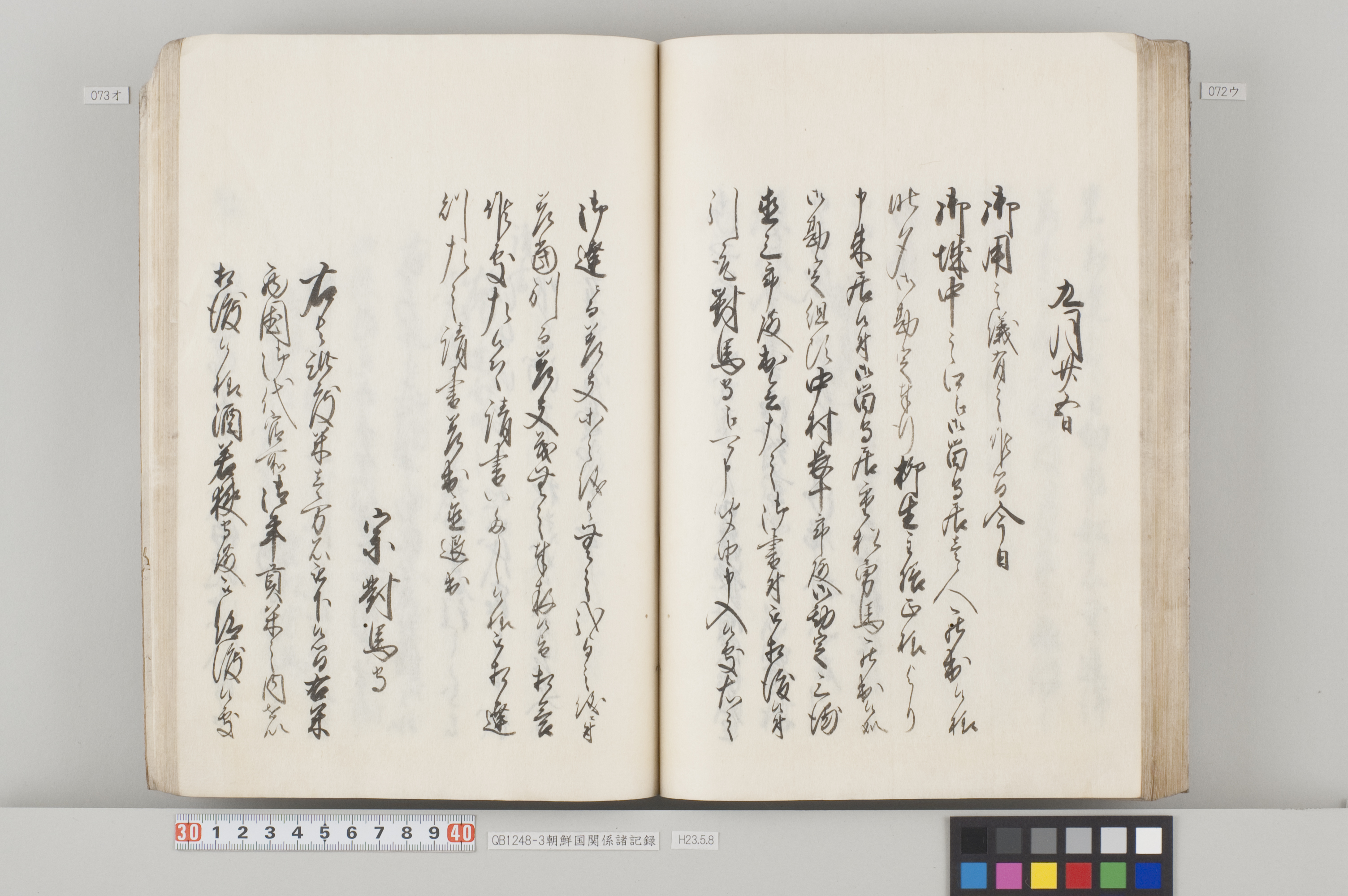 文化12年(1815)から14年にかけて、対馬藩から幕府へ出願した際の記録。3冊ある。 各冊の内容と、表紙に「表御諸札方」と書かれていることから、対馬藩の江戸藩邸で作成された記録の一部であることが分かる。 QB1248-1 全90丁の和装本。表紙には「朝鮮国飢饉ニ付米五万石買取度段、従礼曹参議以書簡懇請在之候付、公義江御拝借御願書被差出候記録」とある。 飢饉に見舞われた朝鮮国から米5万石を買い付けたいとの依頼を受けた対馬藩が、幕府に対して米の支給を出願した際の記録。文化12年3月から同年8月のことが記載されている。 巻末には朝鮮国への船賃の見積もりも記してあるが、実際に朝鮮国へ米が送られたかは、この記録からは分からない。 また、朝鮮国の倭館からの飢饉に関する詳細な報告も記載されている。 QB1248-2 全47丁の和装本。表紙には「訳官入料御願記録 丁丑四月三日御金二千両御手当被仰出」とある。 徳川家慶子竹千代死去に対する弔問の朝鮮国からの使者(訳官)を応接するための費用を援助してほしいと幕府に出願した記録。文化13年12月から同14年4月のことが記載されている。この出願により、対馬藩には2千両の手当てが支給されたことが分かる。 QB1248-3 全130丁の和装本。表紙には「朝鮮国凶年以来入送米相滞御難渋之事情依御願御米壱万石御拝領記録」とある。 対馬は朝鮮国から米を買っていたが飢饉のため米を買うことができなくなり、幕府に援助米を出願し受け取った時の記録。文化13年5月から同14年3月のことが記載されている。 巻末には、延享3年(1746)以降の幕府からの援助の記録や、今回の出願に際して尽力した幕府役人への御礼の目録も収録してある。 なお『徳川実紀』によれば、対馬藩は文化12年7月にも幕府より1万石を拝領している。