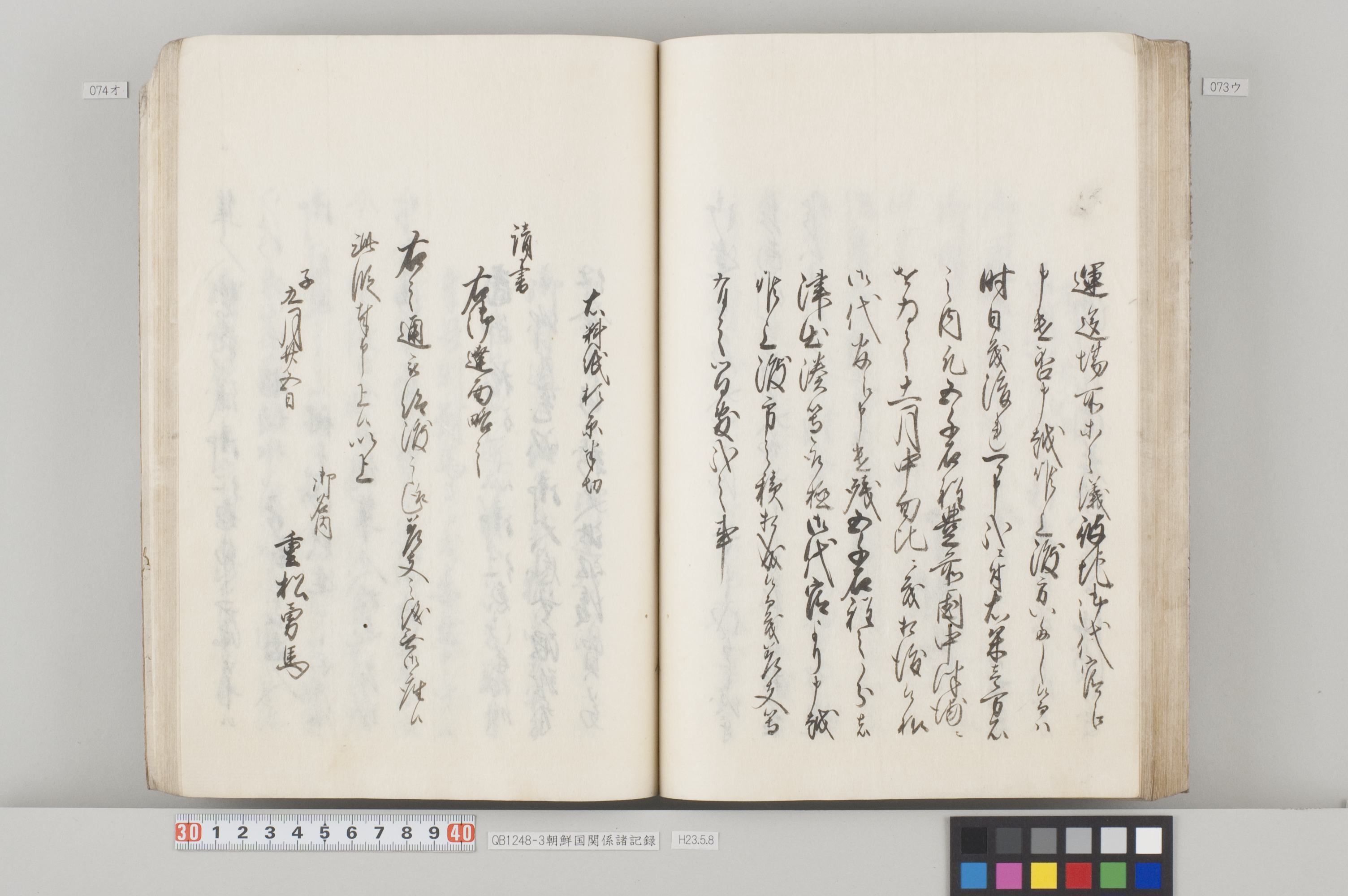 文化12年(1815)から14年にかけて、対馬藩から幕府へ出願した際の記録。3冊ある。 各冊の内容と、表紙に「表御諸札方」と書かれていることから、対馬藩の江戸藩邸で作成された記録の一部であることが分かる。 QB1248-1 全90丁の和装本。表紙には「朝鮮国飢饉ニ付米五万石買取度段、従礼曹参議以書簡懇請在之候付、公義江御拝借御願書被差出候記録」とある。 飢饉に見舞われた朝鮮国から米5万石を買い付けたいとの依頼を受けた対馬藩が、幕府に対して米の支給を出願した際の記録。文化12年3月から同年8月のことが記載されている。 巻末には朝鮮国への船賃の見積もりも記してあるが、実際に朝鮮国へ米が送られたかは、この記録からは分からない。 また、朝鮮国の倭館からの飢饉に関する詳細な報告も記載されている。 QB1248-2 全47丁の和装本。表紙には「訳官入料御願記録 丁丑四月三日御金二千両御手当被仰出」とある。 徳川家慶子竹千代死去に対する弔問の朝鮮国からの使者(訳官)を応接するための費用を援助してほしいと幕府に出願した記録。文化13年12月から同14年4月のことが記載されている。この出願により、対馬藩には2千両の手当てが支給されたことが分かる。 QB1248-3 全130丁の和装本。表紙には「朝鮮国凶年以来入送米相滞御難渋之事情依御願御米壱万石御拝領記録」とある。 対馬は朝鮮国から米を買っていたが飢饉のため米を買うことができなくなり、幕府に援助米を出願し受け取った時の記録。文化13年5月から同14年3月のことが記載されている。 巻末には、延享3年(1746)以降の幕府からの援助の記録や、今回の出願に際して尽力した幕府役人への御礼の目録も収録してある。 なお『徳川実紀』によれば、対馬藩は文化12年7月にも幕府より1万石を拝領している。