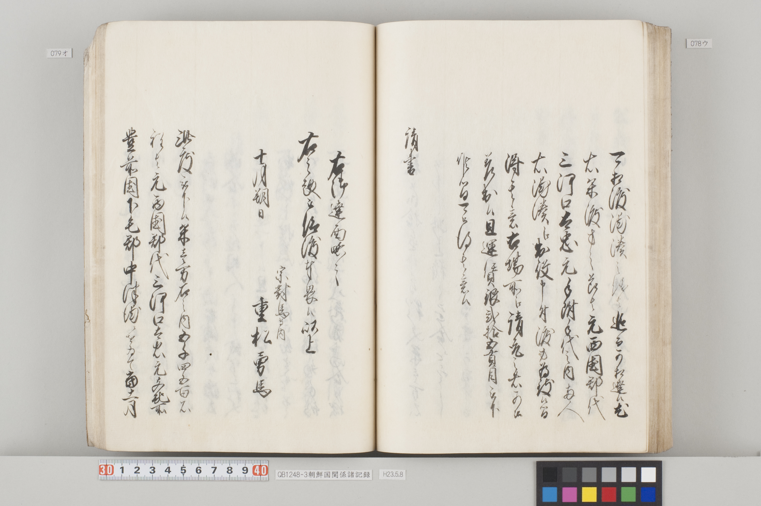 文化12年(1815)から14年にかけて、対馬藩から幕府へ出願した際の記録。3冊ある。 各冊の内容と、表紙に「表御諸札方」と書かれていることから、対馬藩の江戸藩邸で作成された記録の一部であることが分かる。 QB1248-1 全90丁の和装本。表紙には「朝鮮国飢饉ニ付米五万石買取度段、従礼曹参議以書簡懇請在之候付、公義江御拝借御願書被差出候記録」とある。 飢饉に見舞われた朝鮮国から米5万石を買い付けたいとの依頼を受けた対馬藩が、幕府に対して米の支給を出願した際の記録。文化12年3月から同年8月のことが記載されている。 巻末には朝鮮国への船賃の見積もりも記してあるが、実際に朝鮮国へ米が送られたかは、この記録からは分からない。 また、朝鮮国の倭館からの飢饉に関する詳細な報告も記載されている。 QB1248-2 全47丁の和装本。表紙には「訳官入料御願記録 丁丑四月三日御金二千両御手当被仰出」とある。 徳川家慶子竹千代死去に対する弔問の朝鮮国からの使者(訳官)を応接するための費用を援助してほしいと幕府に出願した記録。文化13年12月から同14年4月のことが記載されている。この出願により、対馬藩には2千両の手当てが支給されたことが分かる。 QB1248-3 全130丁の和装本。表紙には「朝鮮国凶年以来入送米相滞御難渋之事情依御願御米壱万石御拝領記録」とある。 対馬は朝鮮国から米を買っていたが飢饉のため米を買うことができなくなり、幕府に援助米を出願し受け取った時の記録。文化13年5月から同14年3月のことが記載されている。 巻末には、延享3年(1746)以降の幕府からの援助の記録や、今回の出願に際して尽力した幕府役人への御礼の目録も収録してある。 なお『徳川実紀』によれば、対馬藩は文化12年7月にも幕府より1万石を拝領している。