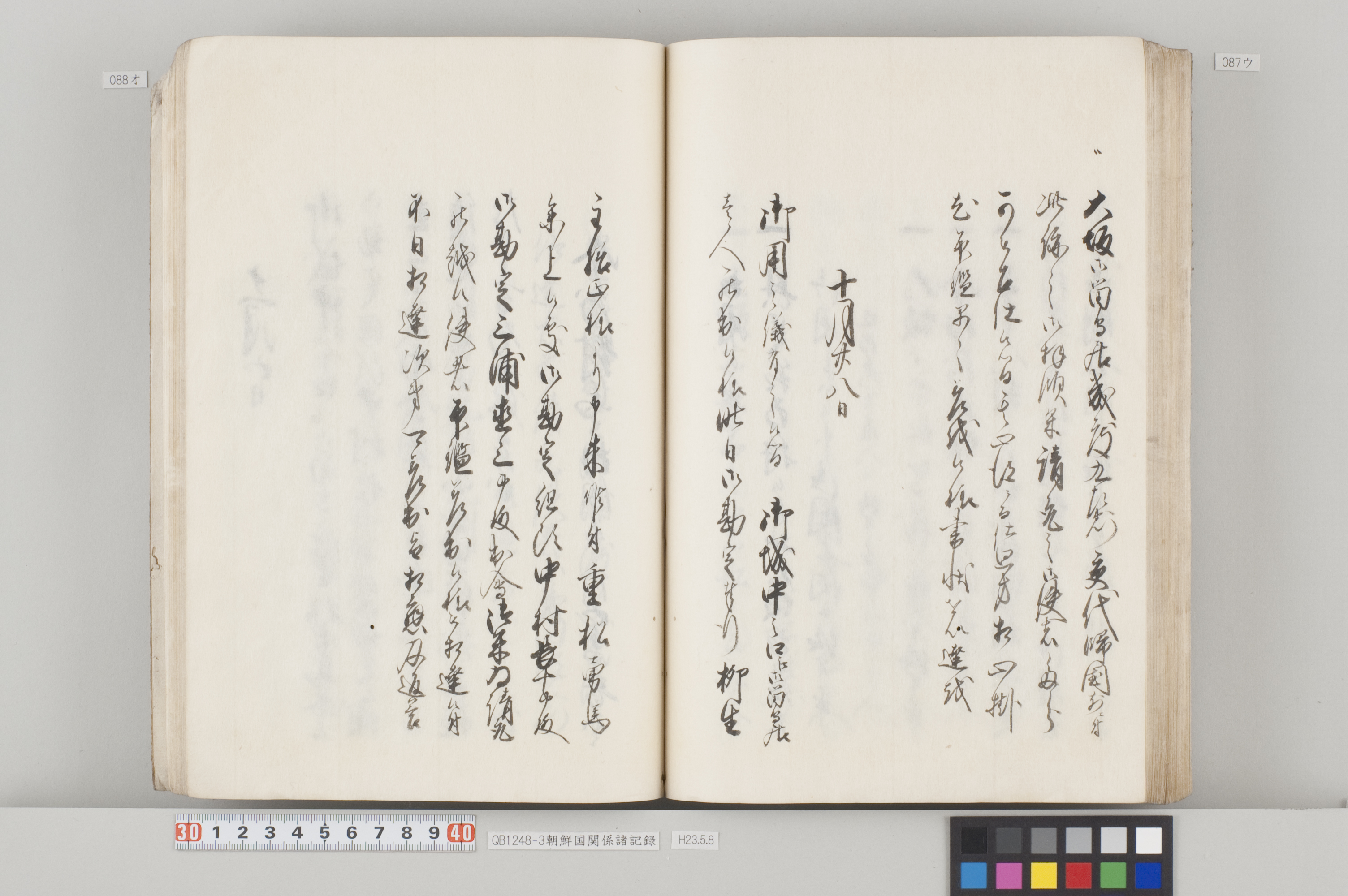 文化12年(1815)から14年にかけて、対馬藩から幕府へ出願した際の記録。3冊ある。 各冊の内容と、表紙に「表御諸札方」と書かれていることから、対馬藩の江戸藩邸で作成された記録の一部であることが分かる。 QB1248-1 全90丁の和装本。表紙には「朝鮮国飢饉ニ付米五万石買取度段、従礼曹参議以書簡懇請在之候付、公義江御拝借御願書被差出候記録」とある。 飢饉に見舞われた朝鮮国から米5万石を買い付けたいとの依頼を受けた対馬藩が、幕府に対して米の支給を出願した際の記録。文化12年3月から同年8月のことが記載されている。 巻末には朝鮮国への船賃の見積もりも記してあるが、実際に朝鮮国へ米が送られたかは、この記録からは分からない。 また、朝鮮国の倭館からの飢饉に関する詳細な報告も記載されている。 QB1248-2 全47丁の和装本。表紙には「訳官入料御願記録 丁丑四月三日御金二千両御手当被仰出」とある。 徳川家慶子竹千代死去に対する弔問の朝鮮国からの使者(訳官)を応接するための費用を援助してほしいと幕府に出願した記録。文化13年12月から同14年4月のことが記載されている。この出願により、対馬藩には2千両の手当てが支給されたことが分かる。 QB1248-3 全130丁の和装本。表紙には「朝鮮国凶年以来入送米相滞御難渋之事情依御願御米壱万石御拝領記録」とある。 対馬は朝鮮国から米を買っていたが飢饉のため米を買うことができなくなり、幕府に援助米を出願し受け取った時の記録。文化13年5月から同14年3月のことが記載されている。 巻末には、延享3年(1746)以降の幕府からの援助の記録や、今回の出願に際して尽力した幕府役人への御礼の目録も収録してある。 なお『徳川実紀』によれば、対馬藩は文化12年7月にも幕府より1万石を拝領している。
