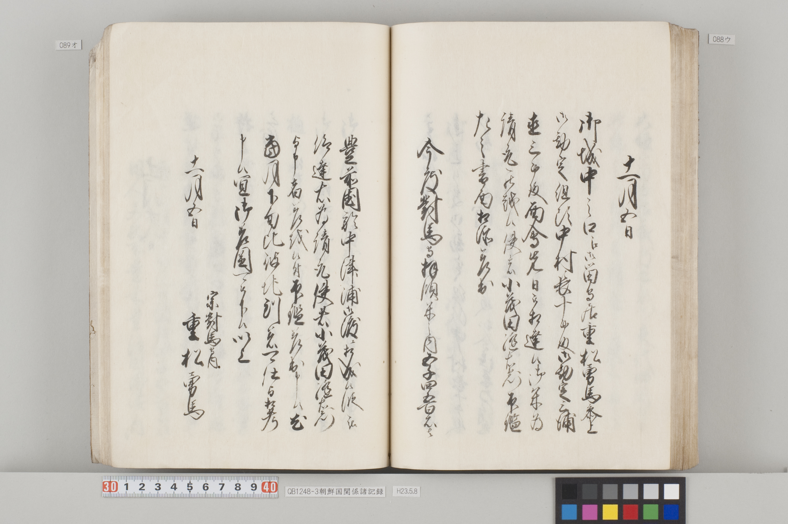 文化12年(1815)から14年にかけて、対馬藩から幕府へ出願した際の記録。3冊ある。 各冊の内容と、表紙に「表御諸札方」と書かれていることから、対馬藩の江戸藩邸で作成された記録の一部であることが分かる。 QB1248-1 全90丁の和装本。表紙には「朝鮮国飢饉ニ付米五万石買取度段、従礼曹参議以書簡懇請在之候付、公義江御拝借御願書被差出候記録」とある。 飢饉に見舞われた朝鮮国から米5万石を買い付けたいとの依頼を受けた対馬藩が、幕府に対して米の支給を出願した際の記録。文化12年3月から同年8月のことが記載されている。 巻末には朝鮮国への船賃の見積もりも記してあるが、実際に朝鮮国へ米が送られたかは、この記録からは分からない。 また、朝鮮国の倭館からの飢饉に関する詳細な報告も記載されている。 QB1248-2 全47丁の和装本。表紙には「訳官入料御願記録 丁丑四月三日御金二千両御手当被仰出」とある。 徳川家慶子竹千代死去に対する弔問の朝鮮国からの使者(訳官)を応接するための費用を援助してほしいと幕府に出願した記録。文化13年12月から同14年4月のことが記載されている。この出願により、対馬藩には2千両の手当てが支給されたことが分かる。 QB1248-3 全130丁の和装本。表紙には「朝鮮国凶年以来入送米相滞御難渋之事情依御願御米壱万石御拝領記録」とある。 対馬は朝鮮国から米を買っていたが飢饉のため米を買うことができなくなり、幕府に援助米を出願し受け取った時の記録。文化13年5月から同14年3月のことが記載されている。 巻末には、延享3年(1746)以降の幕府からの援助の記録や、今回の出願に際して尽力した幕府役人への御礼の目録も収録してある。 なお『徳川実紀』によれば、対馬藩は文化12年7月にも幕府より1万石を拝領している。