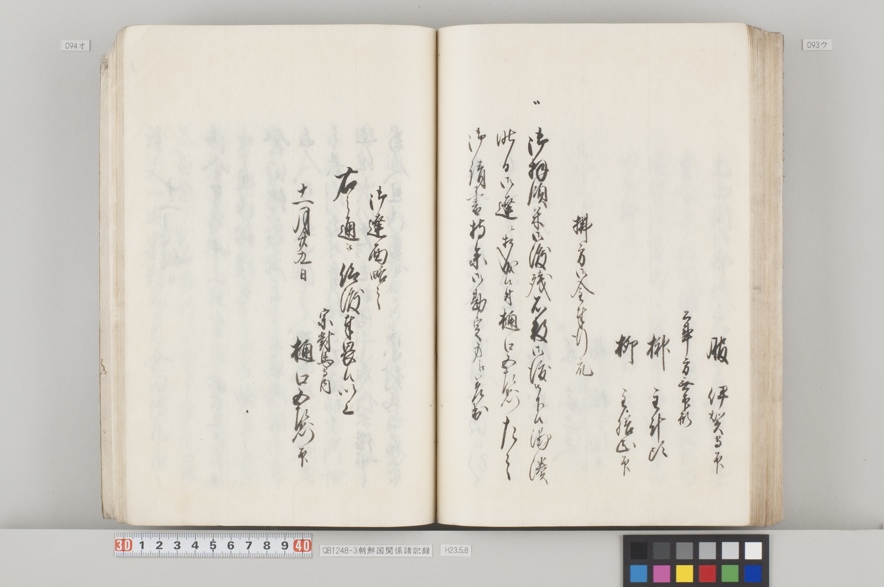 文化12年(1815)から14年にかけて、対馬藩から幕府へ出願した際の記録。3冊ある。 各冊の内容と、表紙に「表御諸札方」と書かれていることから、対馬藩の江戸藩邸で作成された記録の一部であることが分かる。 QB1248-1 全90丁の和装本。表紙には「朝鮮国飢饉ニ付米五万石買取度段、従礼曹参議以書簡懇請在之候付、公義江御拝借御願書被差出候記録」とある。 飢饉に見舞われた朝鮮国から米5万石を買い付けたいとの依頼を受けた対馬藩が、幕府に対して米の支給を出願した際の記録。文化12年3月から同年8月のことが記載されている。 巻末には朝鮮国への船賃の見積もりも記してあるが、実際に朝鮮国へ米が送られたかは、この記録からは分からない。 また、朝鮮国の倭館からの飢饉に関する詳細な報告も記載されている。 QB1248-2 全47丁の和装本。表紙には「訳官入料御願記録 丁丑四月三日御金二千両御手当被仰出」とある。 徳川家慶子竹千代死去に対する弔問の朝鮮国からの使者(訳官)を応接するための費用を援助してほしいと幕府に出願した記録。文化13年12月から同14年4月のことが記載されている。この出願により、対馬藩には2千両の手当てが支給されたことが分かる。 QB1248-3 全130丁の和装本。表紙には「朝鮮国凶年以来入送米相滞御難渋之事情依御願御米壱万石御拝領記録」とある。 対馬は朝鮮国から米を買っていたが飢饉のため米を買うことができなくなり、幕府に援助米を出願し受け取った時の記録。文化13年5月から同14年3月のことが記載されている。 巻末には、延享3年(1746)以降の幕府からの援助の記録や、今回の出願に際して尽力した幕府役人への御礼の目録も収録してある。 なお『徳川実紀』によれば、対馬藩は文化12年7月にも幕府より1万石を拝領している。