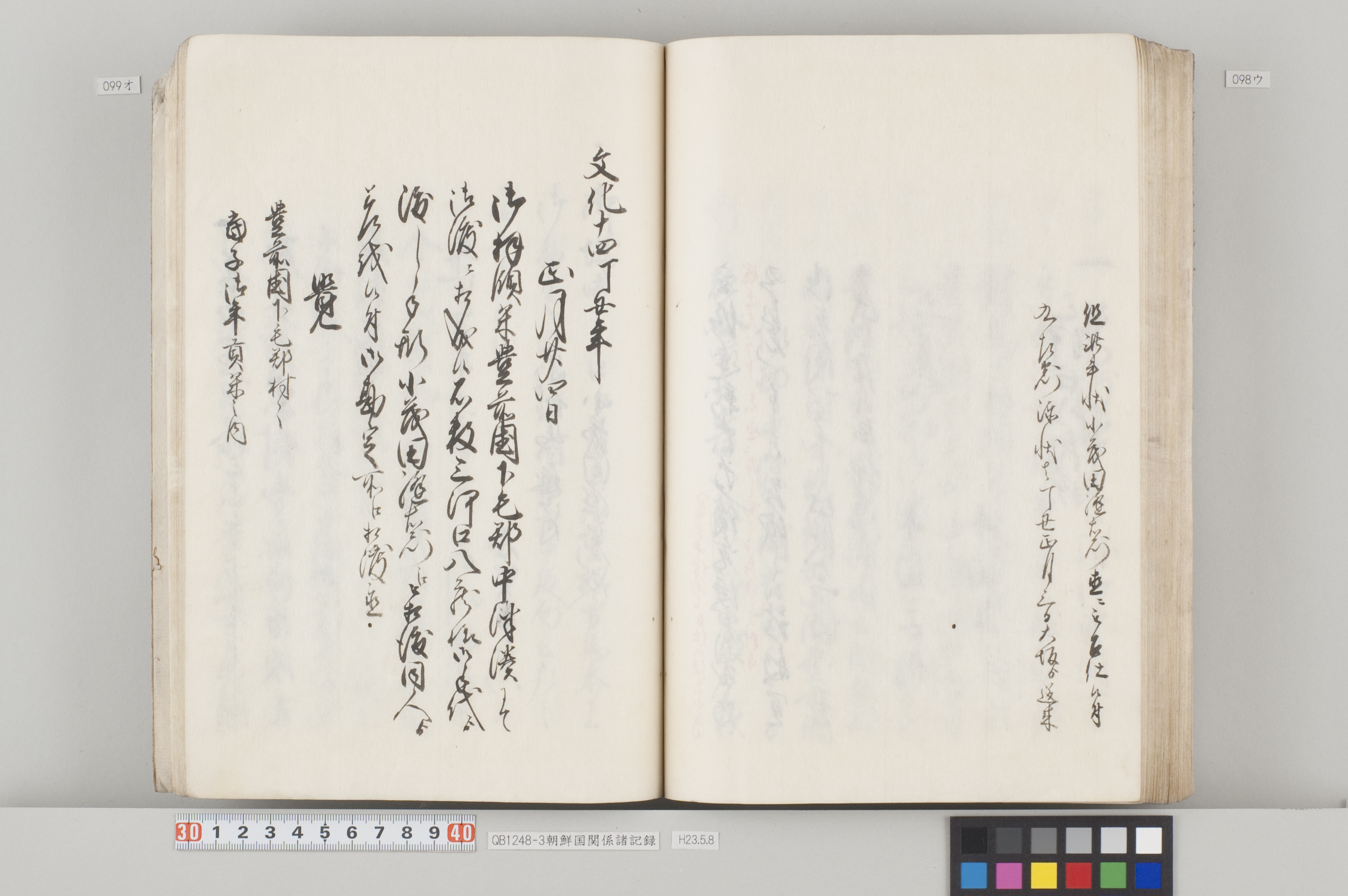 文化12年(1815)から14年にかけて、対馬藩から幕府へ出願した際の記録。3冊ある。 各冊の内容と、表紙に「表御諸札方」と書かれていることから、対馬藩の江戸藩邸で作成された記録の一部であることが分かる。 QB1248-1 全90丁の和装本。表紙には「朝鮮国飢饉ニ付米五万石買取度段、従礼曹参議以書簡懇請在之候付、公義江御拝借御願書被差出候記録」とある。 飢饉に見舞われた朝鮮国から米5万石を買い付けたいとの依頼を受けた対馬藩が、幕府に対して米の支給を出願した際の記録。文化12年3月から同年8月のことが記載されている。 巻末には朝鮮国への船賃の見積もりも記してあるが、実際に朝鮮国へ米が送られたかは、この記録からは分からない。 また、朝鮮国の倭館からの飢饉に関する詳細な報告も記載されている。 QB1248-2 全47丁の和装本。表紙には「訳官入料御願記録 丁丑四月三日御金二千両御手当被仰出」とある。 徳川家慶子竹千代死去に対する弔問の朝鮮国からの使者(訳官)を応接するための費用を援助してほしいと幕府に出願した記録。文化13年12月から同14年4月のことが記載されている。この出願により、対馬藩には2千両の手当てが支給されたことが分かる。 QB1248-3 全130丁の和装本。表紙には「朝鮮国凶年以来入送米相滞御難渋之事情依御願御米壱万石御拝領記録」とある。 対馬は朝鮮国から米を買っていたが飢饉のため米を買うことができなくなり、幕府に援助米を出願し受け取った時の記録。文化13年5月から同14年3月のことが記載されている。 巻末には、延享3年(1746)以降の幕府からの援助の記録や、今回の出願に際して尽力した幕府役人への御礼の目録も収録してある。 なお『徳川実紀』によれば、対馬藩は文化12年7月にも幕府より1万石を拝領している。