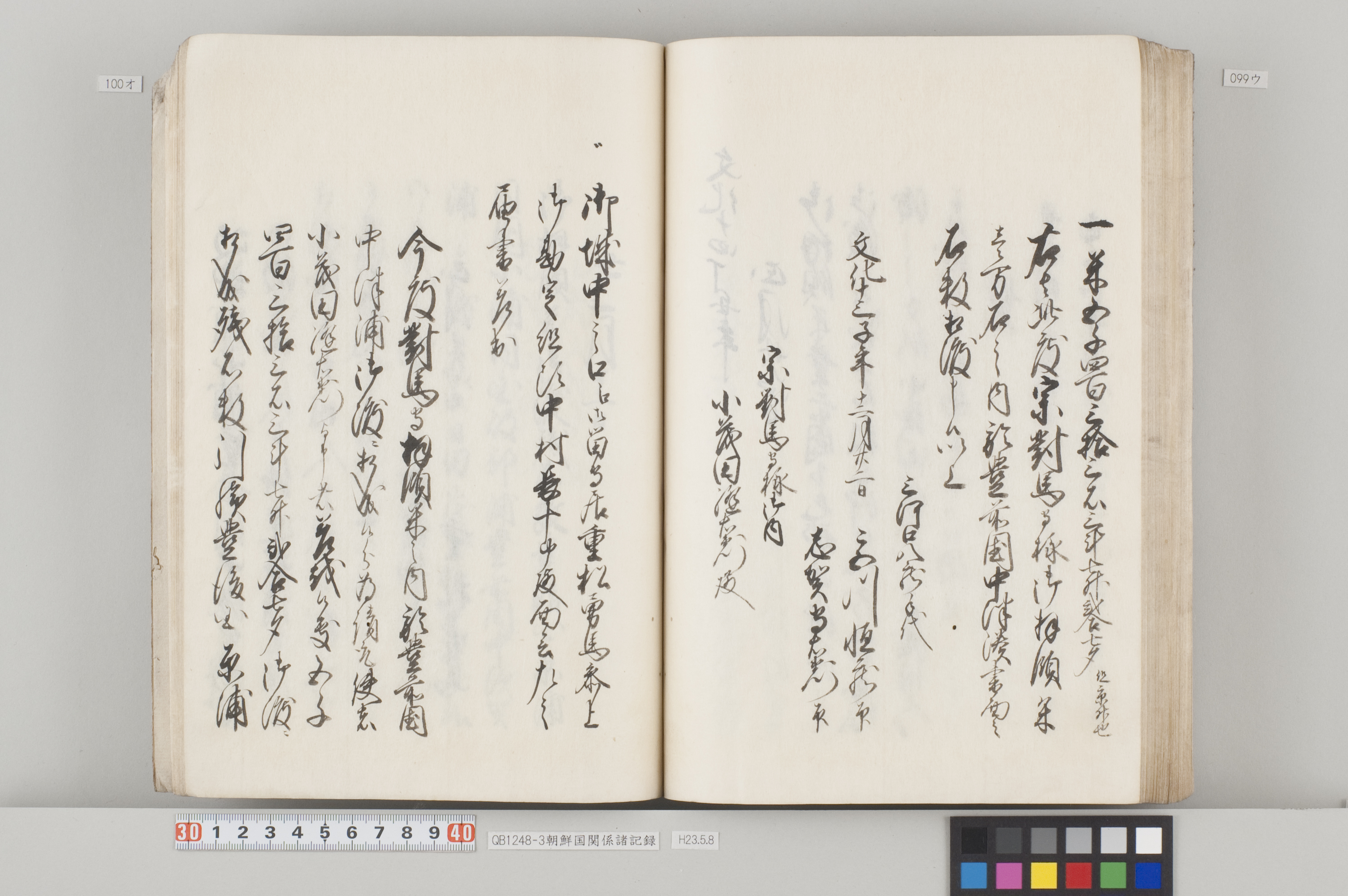 文化12年(1815)から14年にかけて、対馬藩から幕府へ出願した際の記録。3冊ある。 各冊の内容と、表紙に「表御諸札方」と書かれていることから、対馬藩の江戸藩邸で作成された記録の一部であることが分かる。 QB1248-1 全90丁の和装本。表紙には「朝鮮国飢饉ニ付米五万石買取度段、従礼曹参議以書簡懇請在之候付、公義江御拝借御願書被差出候記録」とある。 飢饉に見舞われた朝鮮国から米5万石を買い付けたいとの依頼を受けた対馬藩が、幕府に対して米の支給を出願した際の記録。文化12年3月から同年8月のことが記載されている。 巻末には朝鮮国への船賃の見積もりも記してあるが、実際に朝鮮国へ米が送られたかは、この記録からは分からない。 また、朝鮮国の倭館からの飢饉に関する詳細な報告も記載されている。 QB1248-2 全47丁の和装本。表紙には「訳官入料御願記録 丁丑四月三日御金二千両御手当被仰出」とある。 徳川家慶子竹千代死去に対する弔問の朝鮮国からの使者(訳官)を応接するための費用を援助してほしいと幕府に出願した記録。文化13年12月から同14年4月のことが記載されている。この出願により、対馬藩には2千両の手当てが支給されたことが分かる。 QB1248-3 全130丁の和装本。表紙には「朝鮮国凶年以来入送米相滞御難渋之事情依御願御米壱万石御拝領記録」とある。 対馬は朝鮮国から米を買っていたが飢饉のため米を買うことができなくなり、幕府に援助米を出願し受け取った時の記録。文化13年5月から同14年3月のことが記載されている。 巻末には、延享3年(1746)以降の幕府からの援助の記録や、今回の出願に際して尽力した幕府役人への御礼の目録も収録してある。 なお『徳川実紀』によれば、対馬藩は文化12年7月にも幕府より1万石を拝領している。