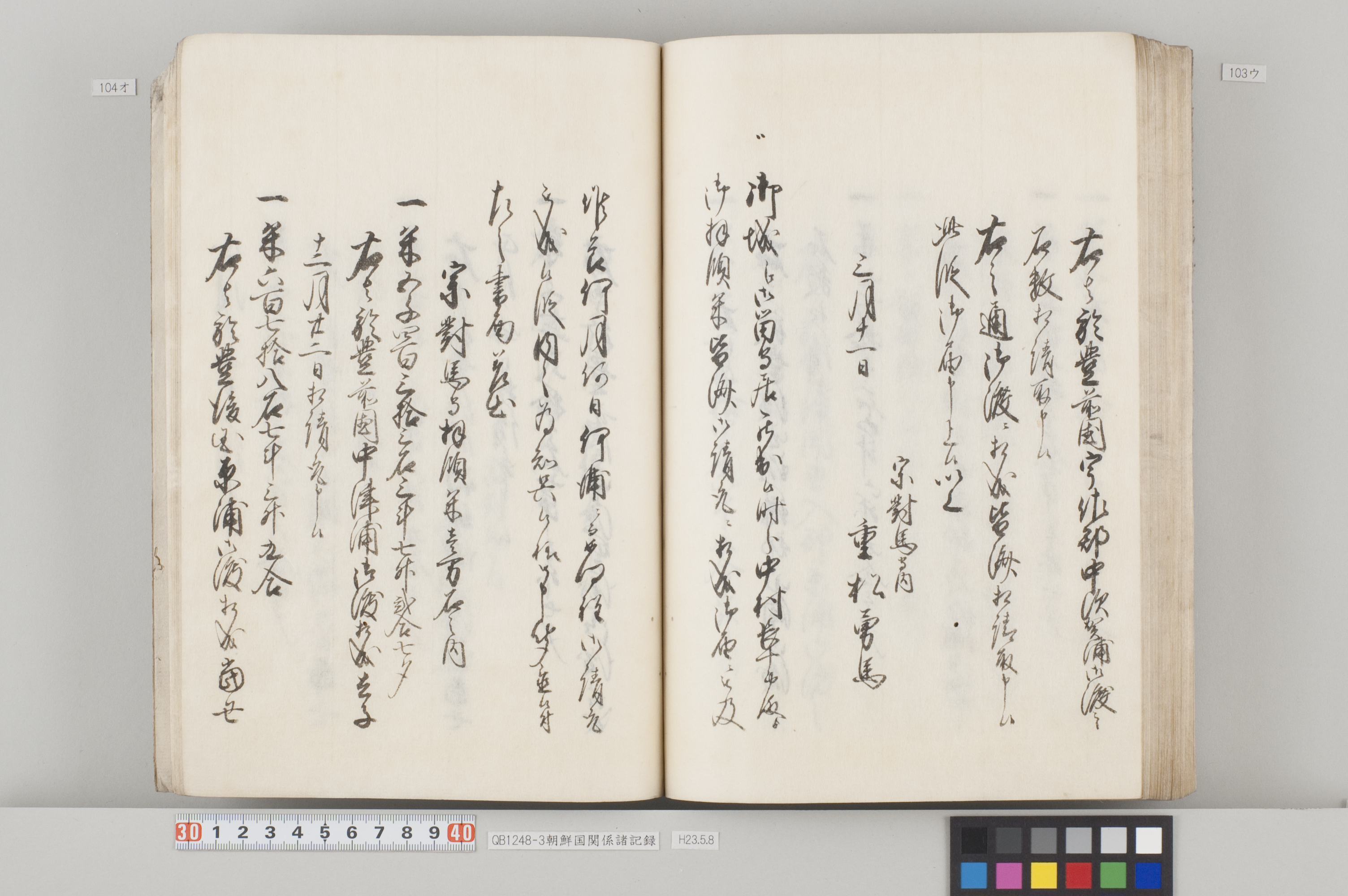 文化12年(1815)から14年にかけて、対馬藩から幕府へ出願した際の記録。3冊ある。 各冊の内容と、表紙に「表御諸札方」と書かれていることから、対馬藩の江戸藩邸で作成された記録の一部であることが分かる。 QB1248-1 全90丁の和装本。表紙には「朝鮮国飢饉ニ付米五万石買取度段、従礼曹参議以書簡懇請在之候付、公義江御拝借御願書被差出候記録」とある。 飢饉に見舞われた朝鮮国から米5万石を買い付けたいとの依頼を受けた対馬藩が、幕府に対して米の支給を出願した際の記録。文化12年3月から同年8月のことが記載されている。 巻末には朝鮮国への船賃の見積もりも記してあるが、実際に朝鮮国へ米が送られたかは、この記録からは分からない。 また、朝鮮国の倭館からの飢饉に関する詳細な報告も記載されている。 QB1248-2 全47丁の和装本。表紙には「訳官入料御願記録 丁丑四月三日御金二千両御手当被仰出」とある。 徳川家慶子竹千代死去に対する弔問の朝鮮国からの使者(訳官)を応接するための費用を援助してほしいと幕府に出願した記録。文化13年12月から同14年4月のことが記載されている。この出願により、対馬藩には2千両の手当てが支給されたことが分かる。 QB1248-3 全130丁の和装本。表紙には「朝鮮国凶年以来入送米相滞御難渋之事情依御願御米壱万石御拝領記録」とある。 対馬は朝鮮国から米を買っていたが飢饉のため米を買うことができなくなり、幕府に援助米を出願し受け取った時の記録。文化13年5月から同14年3月のことが記載されている。 巻末には、延享3年(1746)以降の幕府からの援助の記録や、今回の出願に際して尽力した幕府役人への御礼の目録も収録してある。 なお『徳川実紀』によれば、対馬藩は文化12年7月にも幕府より1万石を拝領している。