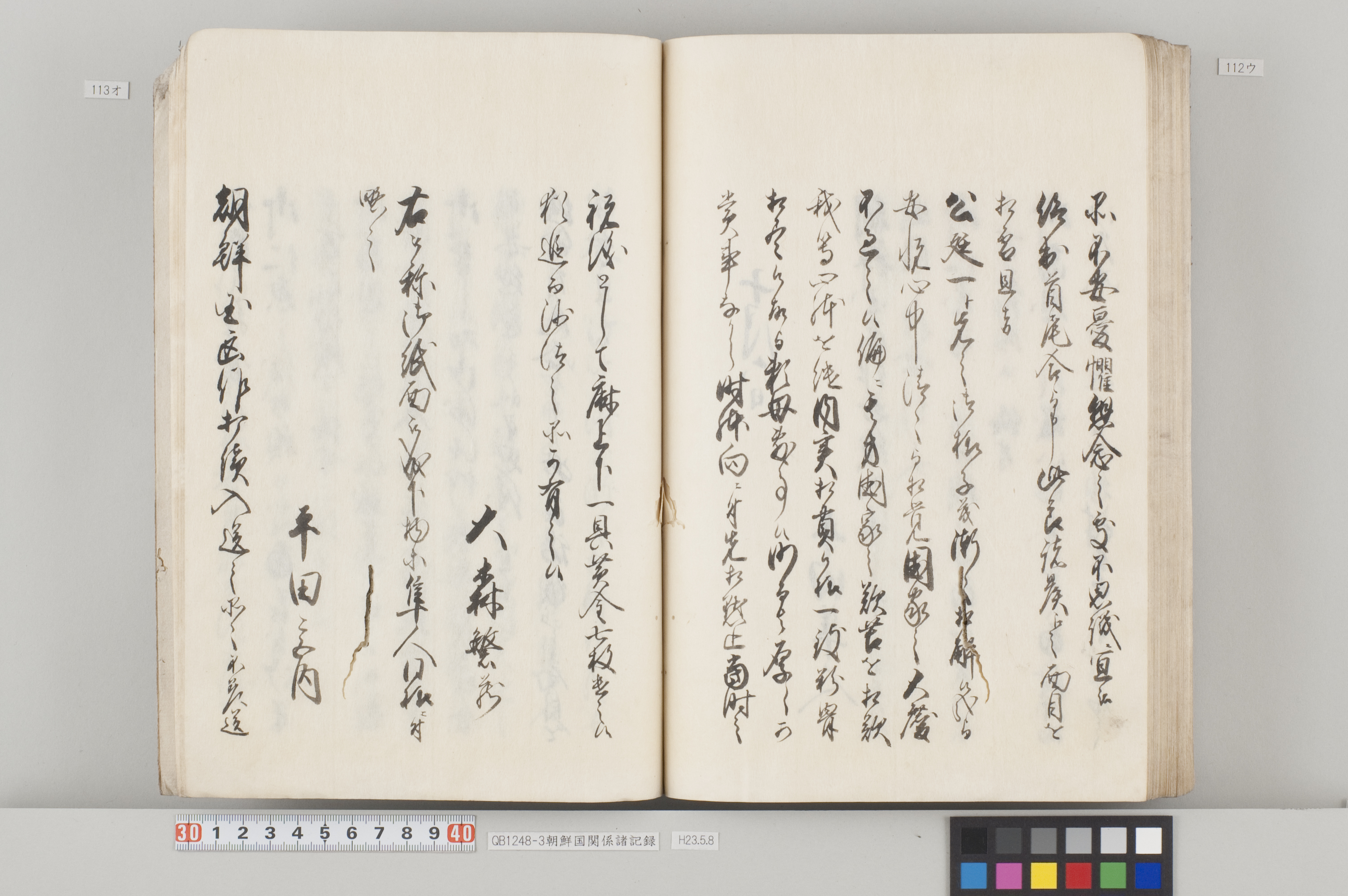 文化12年(1815)から14年にかけて、対馬藩から幕府へ出願した際の記録。3冊ある。 各冊の内容と、表紙に「表御諸札方」と書かれていることから、対馬藩の江戸藩邸で作成された記録の一部であることが分かる。 QB1248-1 全90丁の和装本。表紙には「朝鮮国飢饉ニ付米五万石買取度段、従礼曹参議以書簡懇請在之候付、公義江御拝借御願書被差出候記録」とある。 飢饉に見舞われた朝鮮国から米5万石を買い付けたいとの依頼を受けた対馬藩が、幕府に対して米の支給を出願した際の記録。文化12年3月から同年8月のことが記載されている。 巻末には朝鮮国への船賃の見積もりも記してあるが、実際に朝鮮国へ米が送られたかは、この記録からは分からない。 また、朝鮮国の倭館からの飢饉に関する詳細な報告も記載されている。 QB1248-2 全47丁の和装本。表紙には「訳官入料御願記録 丁丑四月三日御金二千両御手当被仰出」とある。 徳川家慶子竹千代死去に対する弔問の朝鮮国からの使者(訳官)を応接するための費用を援助してほしいと幕府に出願した記録。文化13年12月から同14年4月のことが記載されている。この出願により、対馬藩には2千両の手当てが支給されたことが分かる。 QB1248-3 全130丁の和装本。表紙には「朝鮮国凶年以来入送米相滞御難渋之事情依御願御米壱万石御拝領記録」とある。 対馬は朝鮮国から米を買っていたが飢饉のため米を買うことができなくなり、幕府に援助米を出願し受け取った時の記録。文化13年5月から同14年3月のことが記載されている。 巻末には、延享3年(1746)以降の幕府からの援助の記録や、今回の出願に際して尽力した幕府役人への御礼の目録も収録してある。 なお『徳川実紀』によれば、対馬藩は文化12年7月にも幕府より1万石を拝領している。