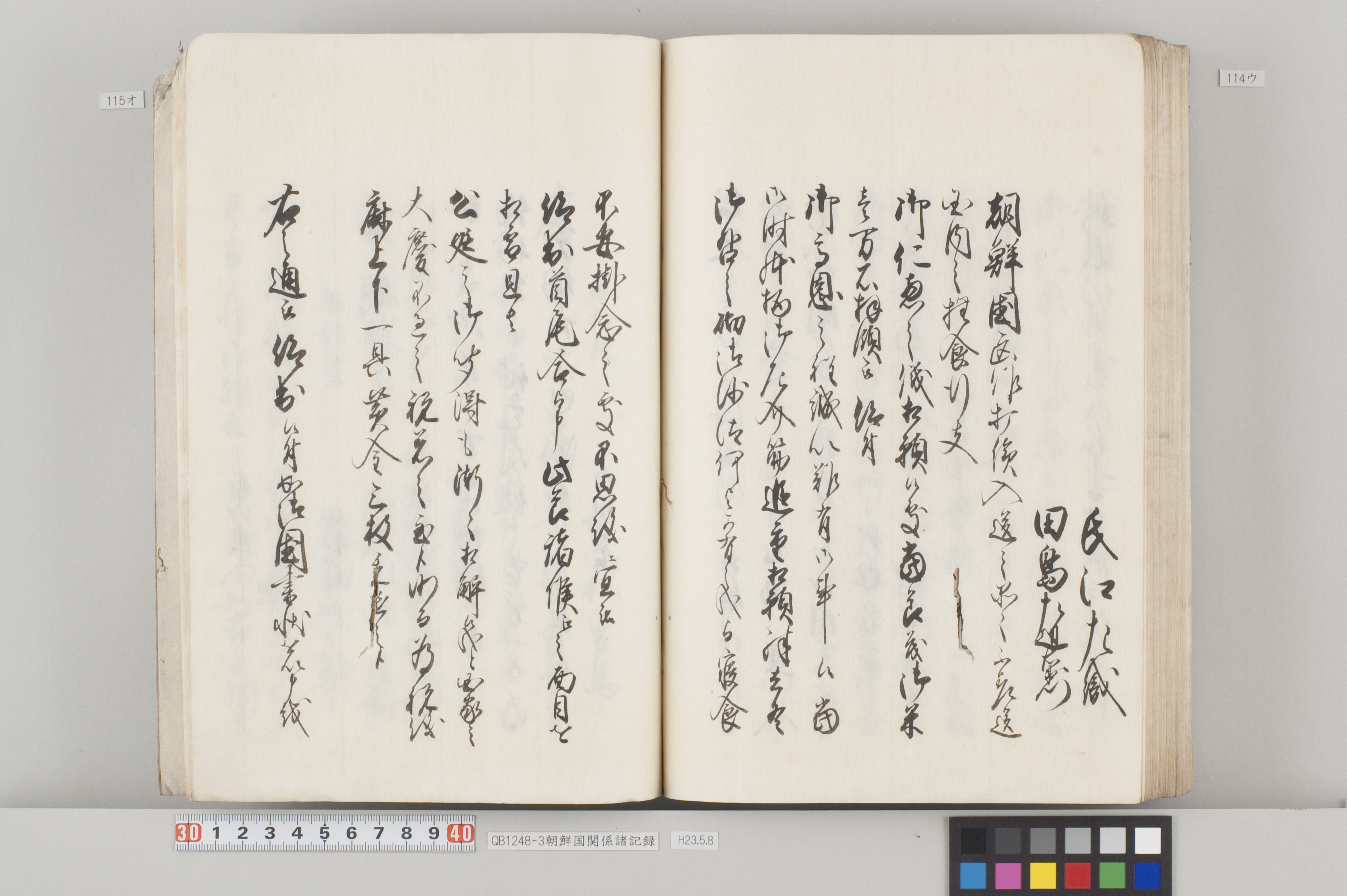 全90丁の和装本。表紙には「朝鮮国飢饉ニ付米五万石買取度段、従礼曹参議以書簡懇請在之候付、公義江御拝借御願書被差出候記録」とある。