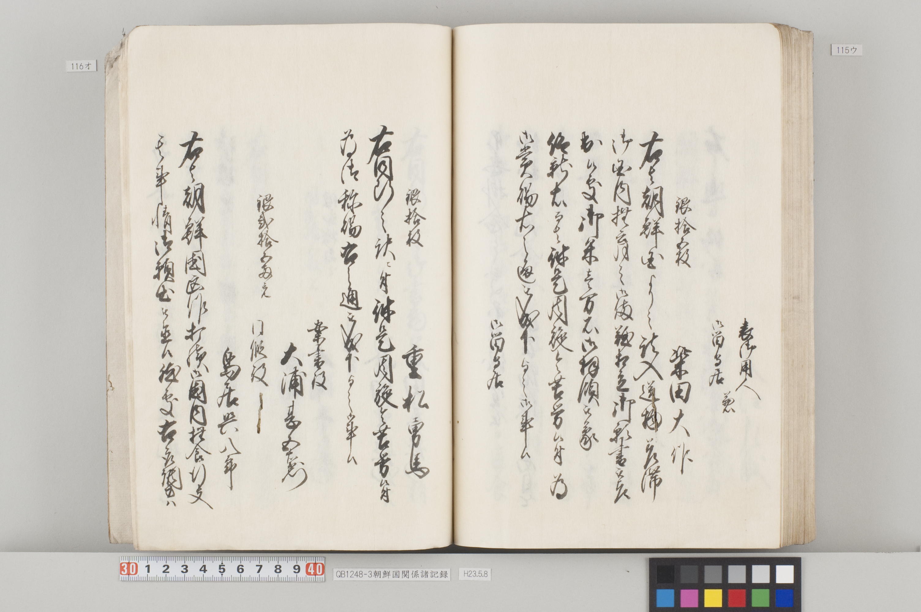 文化12年(1815)から14年にかけて、対馬藩から幕府へ出願した際の記録。3冊ある。 各冊の内容と、表紙に「表御諸札方」と書かれていることから、対馬藩の江戸藩邸で作成された記録の一部であることが分かる。 QB1248-1 全90丁の和装本。表紙には「朝鮮国飢饉ニ付米五万石買取度段、従礼曹参議以書簡懇請在之候付、公義江御拝借御願書被差出候記録」とある。 飢饉に見舞われた朝鮮国から米5万石を買い付けたいとの依頼を受けた対馬藩が、幕府に対して米の支給を出願した際の記録。文化12年3月から同年8月のことが記載されている。 巻末には朝鮮国への船賃の見積もりも記してあるが、実際に朝鮮国へ米が送られたかは、この記録からは分からない。 また、朝鮮国の倭館からの飢饉に関する詳細な報告も記載されている。 QB1248-2 全47丁の和装本。表紙には「訳官入料御願記録 丁丑四月三日御金二千両御手当被仰出」とある。 徳川家慶子竹千代死去に対する弔問の朝鮮国からの使者(訳官)を応接するための費用を援助してほしいと幕府に出願した記録。文化13年12月から同14年4月のことが記載されている。この出願により、対馬藩には2千両の手当てが支給されたことが分かる。 QB1248-3 全130丁の和装本。表紙には「朝鮮国凶年以来入送米相滞御難渋之事情依御願御米壱万石御拝領記録」とある。 対馬は朝鮮国から米を買っていたが飢饉のため米を買うことができなくなり、幕府に援助米を出願し受け取った時の記録。文化13年5月から同14年3月のことが記載されている。 巻末には、延享3年(1746)以降の幕府からの援助の記録や、今回の出願に際して尽力した幕府役人への御礼の目録も収録してある。 なお『徳川実紀』によれば、対馬藩は文化12年7月にも幕府より1万石を拝領している。