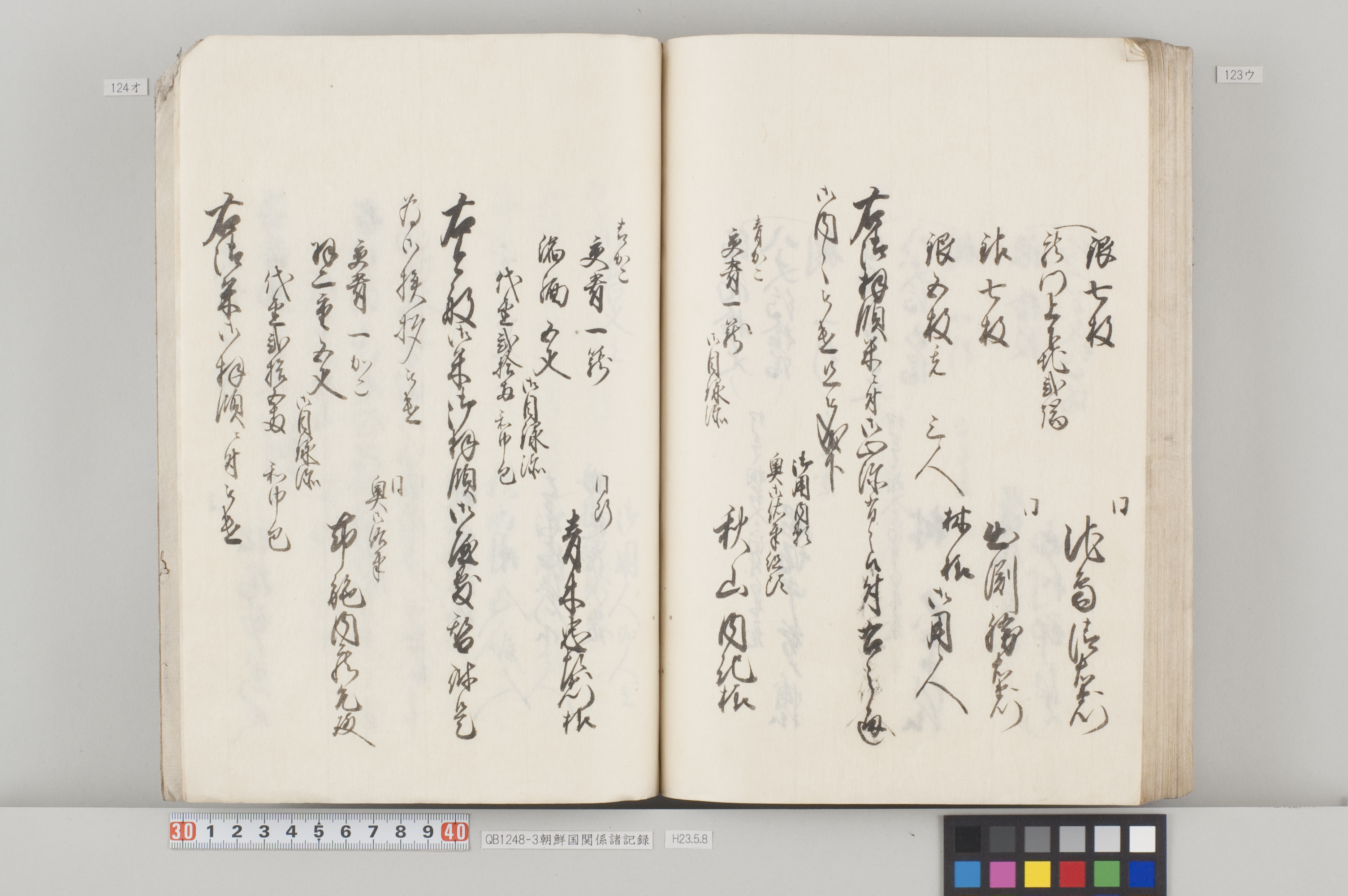文化12年(1815)から14年にかけて、対馬藩から幕府へ出願した際の記録。3冊ある。 各冊の内容と、表紙に「表御諸札方」と書かれていることから、対馬藩の江戸藩邸で作成された記録の一部であることが分かる。 QB1248-1 全90丁の和装本。表紙には「朝鮮国飢饉ニ付米五万石買取度段、従礼曹参議以書簡懇請在之候付、公義江御拝借御願書被差出候記録」とある。 飢饉に見舞われた朝鮮国から米5万石を買い付けたいとの依頼を受けた対馬藩が、幕府に対して米の支給を出願した際の記録。文化12年3月から同年8月のことが記載されている。 巻末には朝鮮国への船賃の見積もりも記してあるが、実際に朝鮮国へ米が送られたかは、この記録からは分からない。 また、朝鮮国の倭館からの飢饉に関する詳細な報告も記載されている。 QB1248-2 全47丁の和装本。表紙には「訳官入料御願記録 丁丑四月三日御金二千両御手当被仰出」とある。 徳川家慶子竹千代死去に対する弔問の朝鮮国からの使者(訳官)を応接するための費用を援助してほしいと幕府に出願した記録。文化13年12月から同14年4月のことが記載されている。この出願により、対馬藩には2千両の手当てが支給されたことが分かる。 QB1248-3 全130丁の和装本。表紙には「朝鮮国凶年以来入送米相滞御難渋之事情依御願御米壱万石御拝領記録」とある。 対馬は朝鮮国から米を買っていたが飢饉のため米を買うことができなくなり、幕府に援助米を出願し受け取った時の記録。文化13年5月から同14年3月のことが記載されている。 巻末には、延享3年(1746)以降の幕府からの援助の記録や、今回の出願に際して尽力した幕府役人への御礼の目録も収録してある。 なお『徳川実紀』によれば、対馬藩は文化12年7月にも幕府より1万石を拝領している。