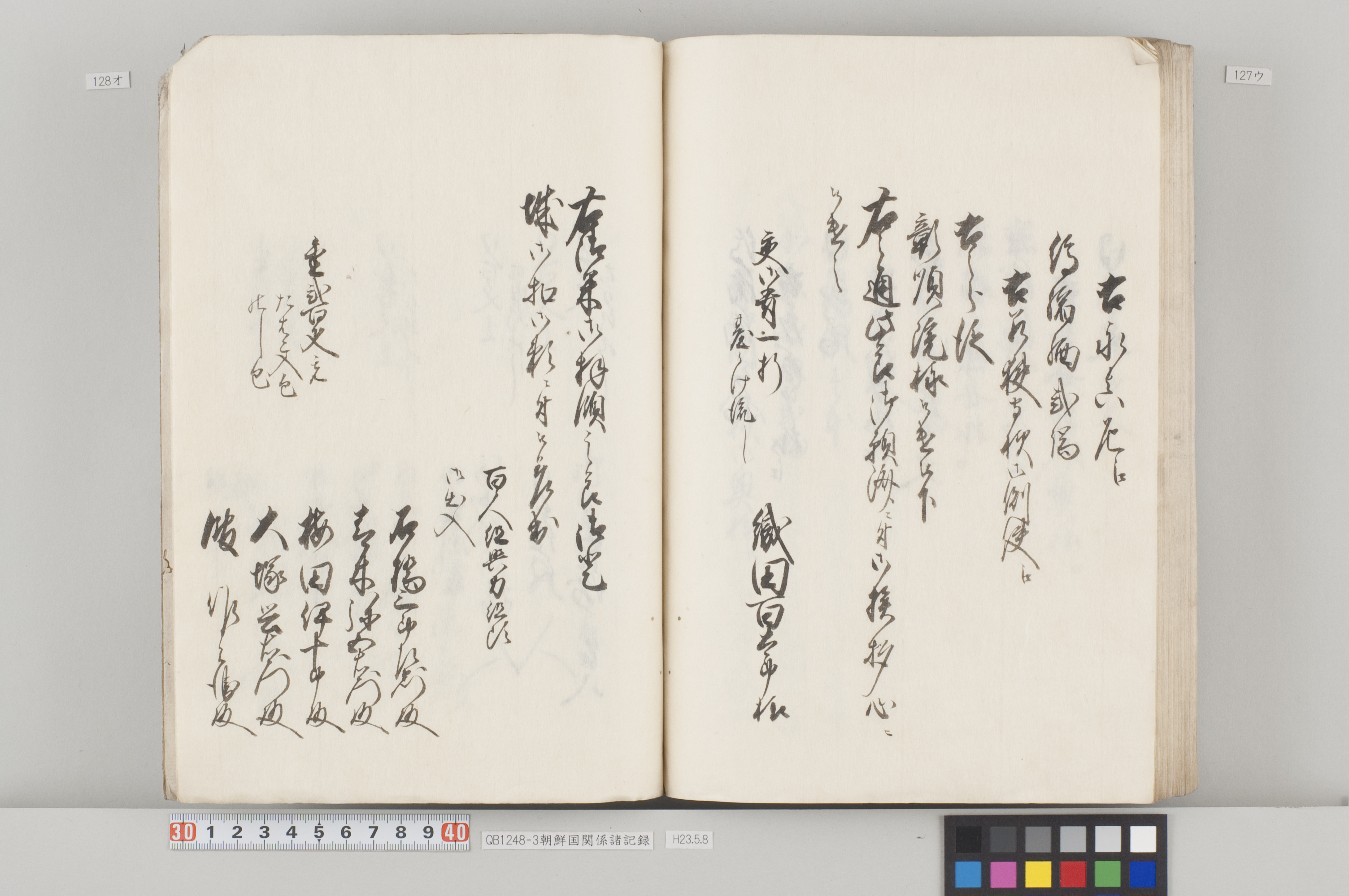 文化12年(1815)から14年にかけて、対馬藩から幕府へ出願した際の記録。3冊ある。 各冊の内容と、表紙に「表御諸札方」と書かれていることから、対馬藩の江戸藩邸で作成された記録の一部であることが分かる。 QB1248-1 全90丁の和装本。表紙には「朝鮮国飢饉ニ付米五万石買取度段、従礼曹参議以書簡懇請在之候付、公義江御拝借御願書被差出候記録」とある。 飢饉に見舞われた朝鮮国から米5万石を買い付けたいとの依頼を受けた対馬藩が、幕府に対して米の支給を出願した際の記録。文化12年3月から同年8月のことが記載されている。 巻末には朝鮮国への船賃の見積もりも記してあるが、実際に朝鮮国へ米が送られたかは、この記録からは分からない。 また、朝鮮国の倭館からの飢饉に関する詳細な報告も記載されている。 QB1248-2 全47丁の和装本。表紙には「訳官入料御願記録 丁丑四月三日御金二千両御手当被仰出」とある。 徳川家慶子竹千代死去に対する弔問の朝鮮国からの使者(訳官)を応接するための費用を援助してほしいと幕府に出願した記録。文化13年12月から同14年4月のことが記載されている。この出願により、対馬藩には2千両の手当てが支給されたことが分かる。 QB1248-3 全130丁の和装本。表紙には「朝鮮国凶年以来入送米相滞御難渋之事情依御願御米壱万石御拝領記録」とある。 対馬は朝鮮国から米を買っていたが飢饉のため米を買うことができなくなり、幕府に援助米を出願し受け取った時の記録。文化13年5月から同14年3月のことが記載されている。 巻末には、延享3年(1746)以降の幕府からの援助の記録や、今回の出願に際して尽力した幕府役人への御礼の目録も収録してある。 なお『徳川実紀』によれば、対馬藩は文化12年7月にも幕府より1万石を拝領している。