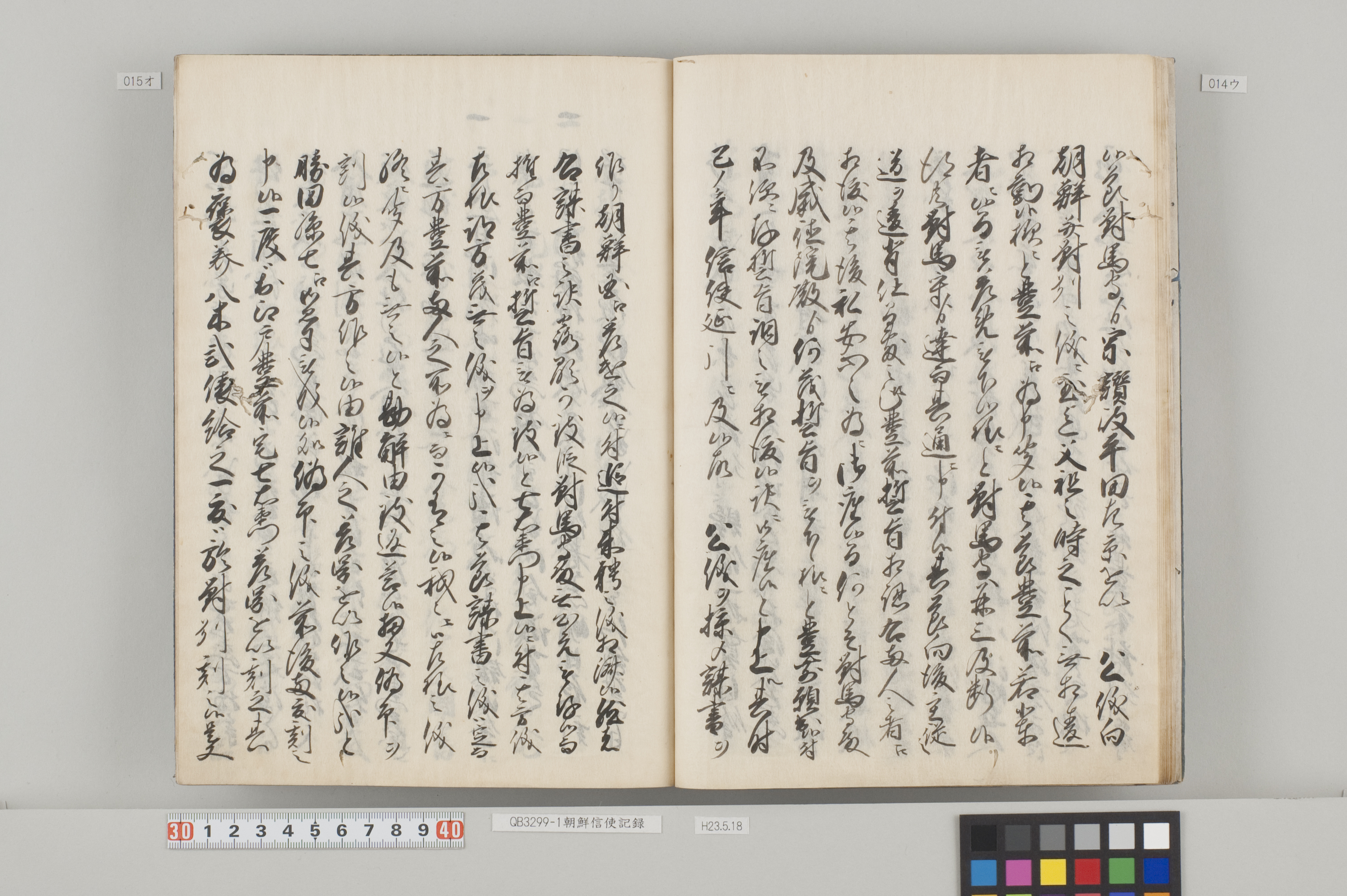 題箋に「寛永丙子信使記録」と記す14巻8冊の和装本。徳川宗敬氏からの寄贈本。 対馬藩主の宗義成を法名「光雲院」で呼んでいることから、彼の死後(明暦3年10月26日(1657))にまとめられたと思われる。 巻一の冒頭に「朝鮮信使来聘起本」という序文を掲げ、わが国における朝鮮との交流の歴史を述べている。また、全体の内容は「朝鮮通信使の記録」というよりも、寛永8年(1631)2月から同14年2月までの「対馬藩の朝鮮国関係記録」と言った方がふさわしい。 寛永13年度の朝鮮通信使に関する詳細な記録がなされているのはもちろん、対馬藩家老の柳川調興が国書改竄等を幕府に訴え関係者が処罰された事件(柳川一件)や、柳川一件の際に対馬で行われた幕府の調査の内容、徳川家光の所望により朝鮮国から来日した馬上才(曲馬)の上覧についても事細かに記述されている。 なお、七巻に「寛永十二年」と書かれているが「寛永十一年」の誤記である。