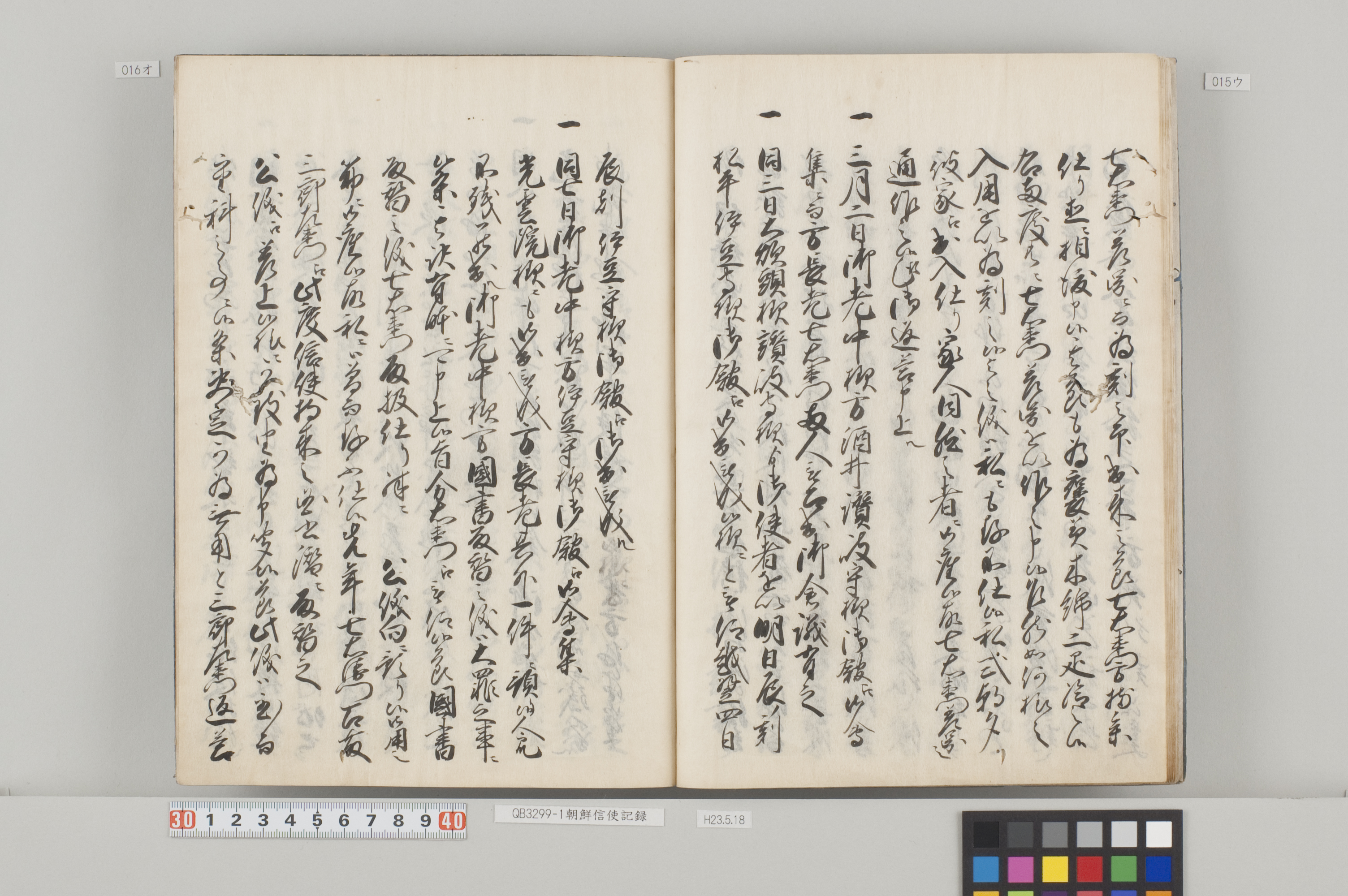 題箋に「寛永丙子信使記録」と記す14巻8冊の和装本。徳川宗敬氏からの寄贈本。 対馬藩主の宗義成を法名「光雲院」で呼んでいることから、彼の死後(明暦3年10月26日(1657))にまとめられたと思われる。 巻一の冒頭に「朝鮮信使来聘起本」という序文を掲げ、わが国における朝鮮との交流の歴史を述べている。また、全体の内容は「朝鮮通信使の記録」というよりも、寛永8年(1631)2月から同14年2月までの「対馬藩の朝鮮国関係記録」と言った方がふさわしい。 寛永13年度の朝鮮通信使に関する詳細な記録がなされているのはもちろん、対馬藩家老の柳川調興が国書改竄等を幕府に訴え関係者が処罰された事件(柳川一件)や、柳川一件の際に対馬で行われた幕府の調査の内容、徳川家光の所望により朝鮮国から来日した馬上才(曲馬)の上覧についても事細かに記述されている。 なお、七巻に「寛永十二年」と書かれているが「寛永十一年」の誤記である。