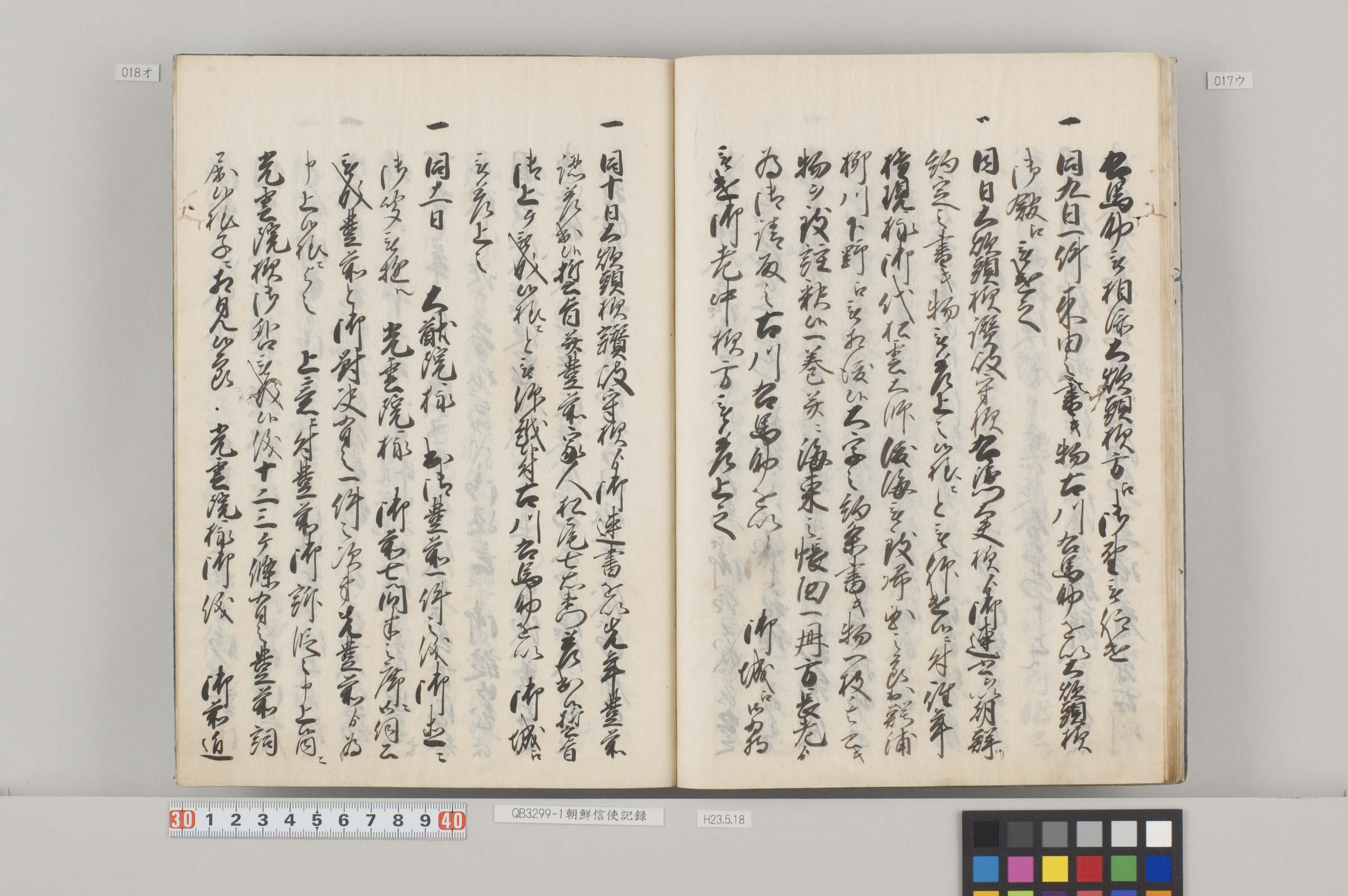 題箋に「寛永丙子信使記録」と記す14巻8冊の和装本。徳川宗敬氏からの寄贈本。 対馬藩主の宗義成を法名「光雲院」で呼んでいることから、彼の死後(明暦3年10月26日(1657))にまとめられたと思われる。 巻一の冒頭に「朝鮮信使来聘起本」という序文を掲げ、わが国における朝鮮との交流の歴史を述べている。また、全体の内容は「朝鮮通信使の記録」というよりも、寛永8年(1631)2月から同14年2月までの「対馬藩の朝鮮国関係記録」と言った方がふさわしい。 寛永13年度の朝鮮通信使に関する詳細な記録がなされているのはもちろん、対馬藩家老の柳川調興が国書改竄等を幕府に訴え関係者が処罰された事件(柳川一件)や、柳川一件の際に対馬で行われた幕府の調査の内容、徳川家光の所望により朝鮮国から来日した馬上才(曲馬)の上覧についても事細かに記述されている。 なお、七巻に「寛永十二年」と書かれているが「寛永十一年」の誤記である。