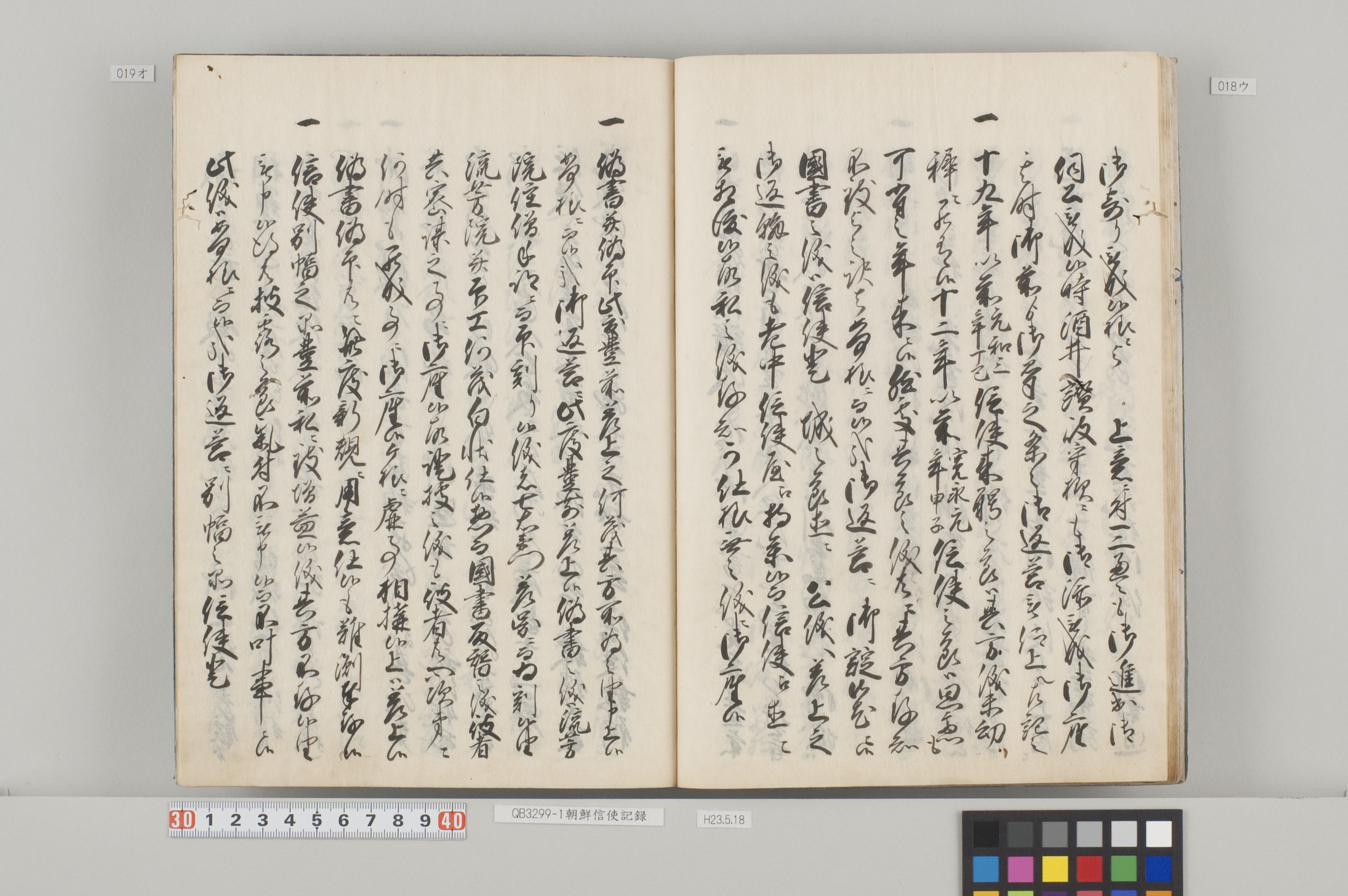 題箋に「寛永丙子信使記録」と記す14巻8冊の和装本。徳川宗敬氏からの寄贈本。 対馬藩主の宗義成を法名「光雲院」で呼んでいることから、彼の死後(明暦3年10月26日(1657))にまとめられたと思われる。 巻一の冒頭に「朝鮮信使来聘起本」という序文を掲げ、わが国における朝鮮との交流の歴史を述べている。また、全体の内容は「朝鮮通信使の記録」というよりも、寛永8年(1631)2月から同14年2月までの「対馬藩の朝鮮国関係記録」と言った方がふさわしい。 寛永13年度の朝鮮通信使に関する詳細な記録がなされているのはもちろん、対馬藩家老の柳川調興が国書改竄等を幕府に訴え関係者が処罰された事件(柳川一件)や、柳川一件の際に対馬で行われた幕府の調査の内容、徳川家光の所望により朝鮮国から来日した馬上才(曲馬)の上覧についても事細かに記述されている。 なお、七巻に「寛永十二年」と書かれているが「寛永十一年」の誤記である。