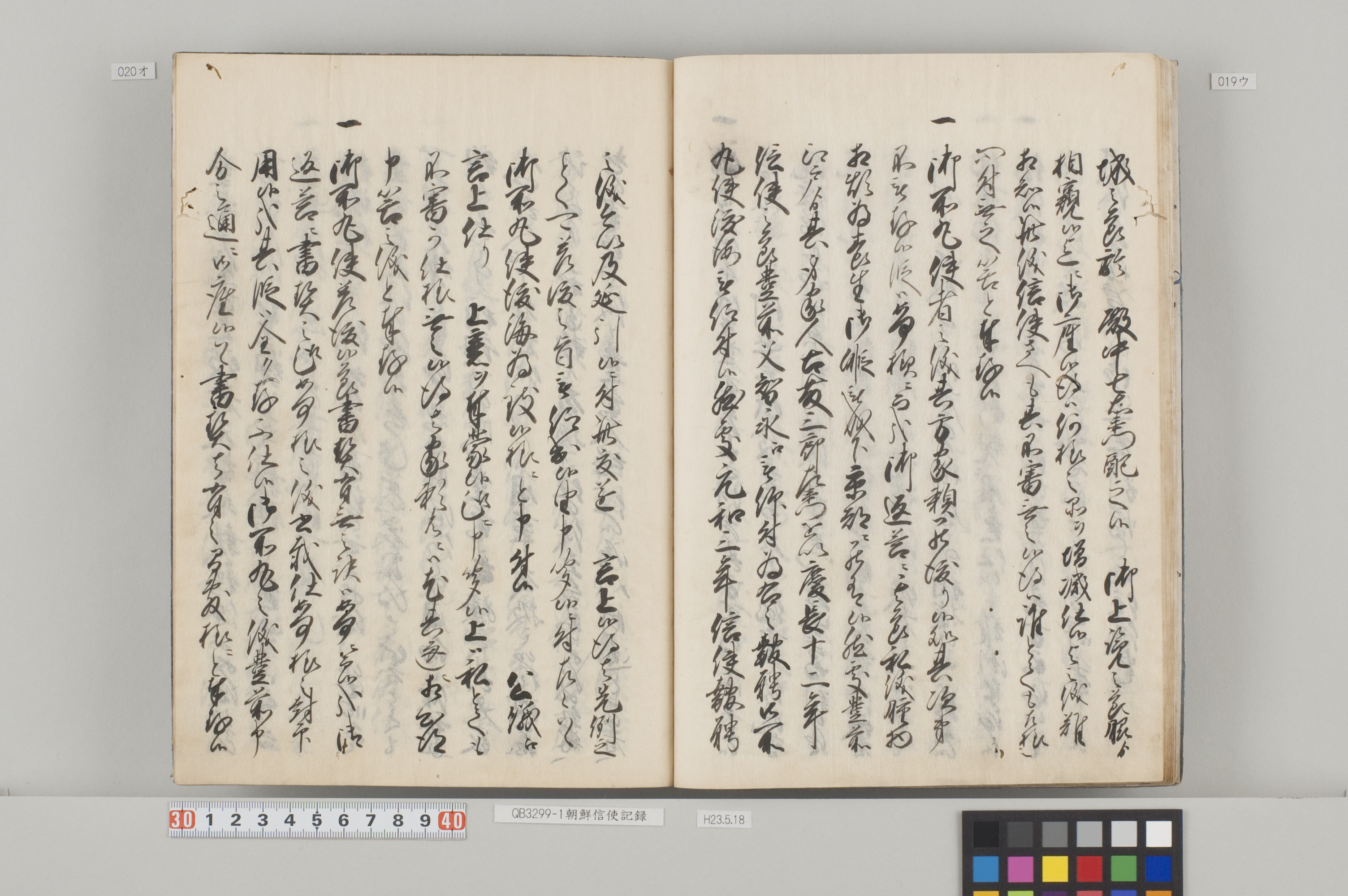 題箋に「寛永丙子信使記録」と記す14巻8冊の和装本。徳川宗敬氏からの寄贈本。 対馬藩主の宗義成を法名「光雲院」で呼んでいることから、彼の死後(明暦3年10月26日(1657))にまとめられたと思われる。 巻一の冒頭に「朝鮮信使来聘起本」という序文を掲げ、わが国における朝鮮との交流の歴史を述べている。また、全体の内容は「朝鮮通信使の記録」というよりも、寛永8年(1631)2月から同14年2月までの「対馬藩の朝鮮国関係記録」と言った方がふさわしい。 寛永13年度の朝鮮通信使に関する詳細な記録がなされているのはもちろん、対馬藩家老の柳川調興が国書改竄等を幕府に訴え関係者が処罰された事件(柳川一件)や、柳川一件の際に対馬で行われた幕府の調査の内容、徳川家光の所望により朝鮮国から来日した馬上才(曲馬)の上覧についても事細かに記述されている。 なお、七巻に「寛永十二年」と書かれているが「寛永十一年」の誤記である。