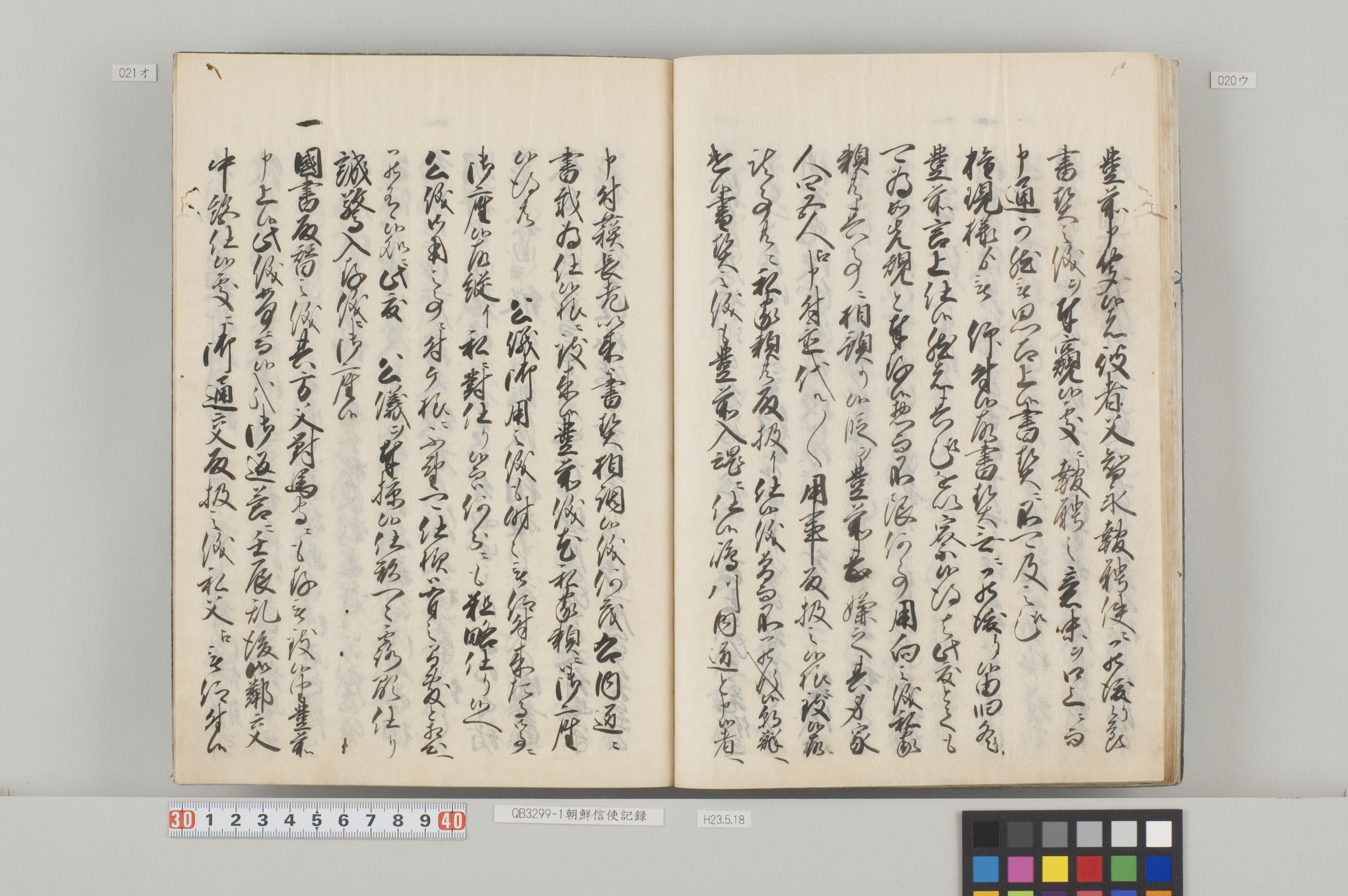 題箋に「寛永丙子信使記録」と記す14巻8冊の和装本。徳川宗敬氏からの寄贈本。 対馬藩主の宗義成を法名「光雲院」で呼んでいることから、彼の死後(明暦3年10月26日(1657))にまとめられたと思われる。 巻一の冒頭に「朝鮮信使来聘起本」という序文を掲げ、わが国における朝鮮との交流の歴史を述べている。また、全体の内容は「朝鮮通信使の記録」というよりも、寛永8年(1631)2月から同14年2月までの「対馬藩の朝鮮国関係記録」と言った方がふさわしい。 寛永13年度の朝鮮通信使に関する詳細な記録がなされているのはもちろん、対馬藩家老の柳川調興が国書改竄等を幕府に訴え関係者が処罰された事件(柳川一件)や、柳川一件の際に対馬で行われた幕府の調査の内容、徳川家光の所望により朝鮮国から来日した馬上才(曲馬)の上覧についても事細かに記述されている。 なお、七巻に「寛永十二年」と書かれているが「寛永十一年」の誤記である。
