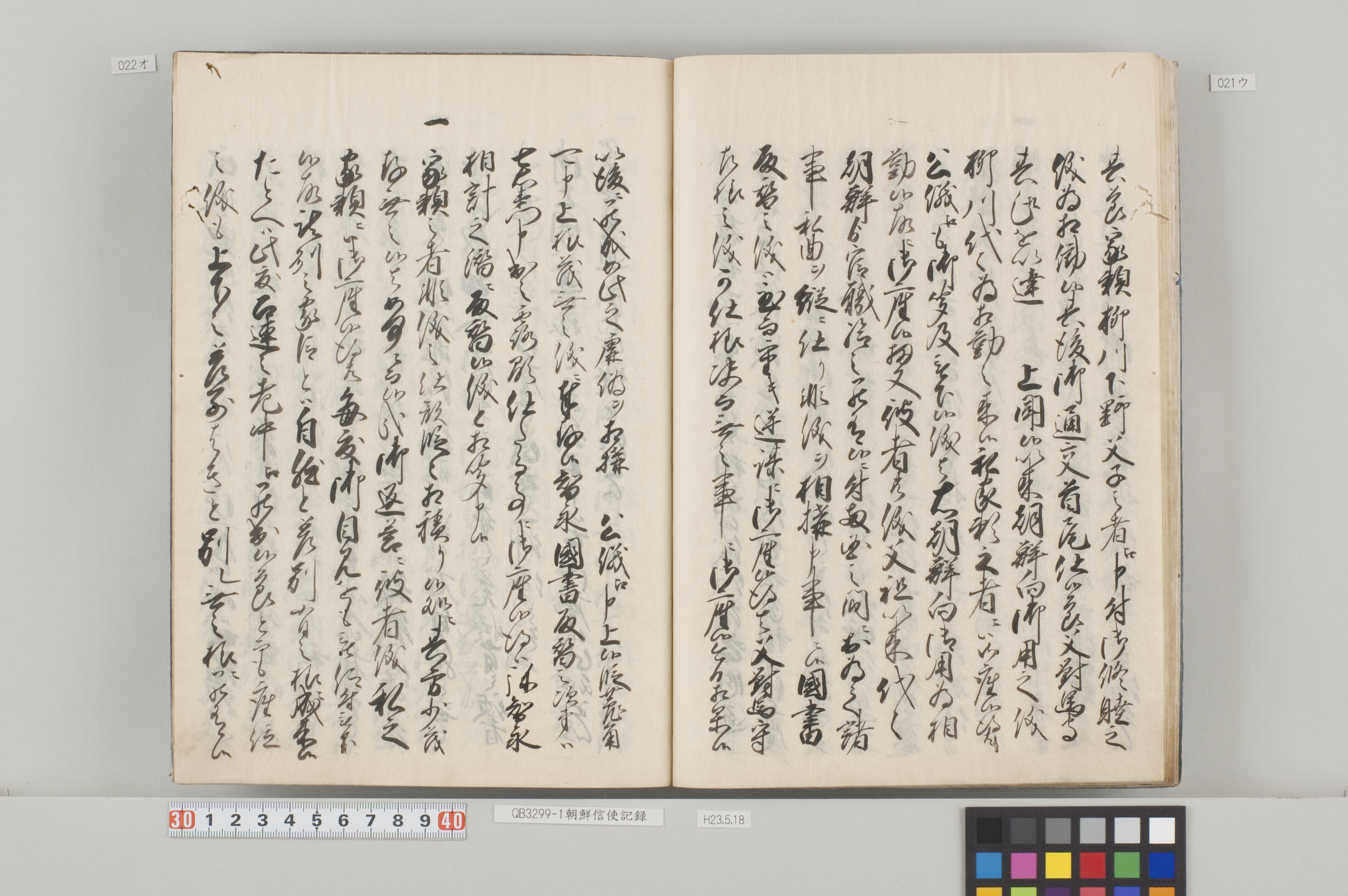 題箋に「寛永丙子信使記録」と記す14巻8冊の和装本。徳川宗敬氏からの寄贈本。 対馬藩主の宗義成を法名「光雲院」で呼んでいることから、彼の死後(明暦3年10月26日(1657))にまとめられたと思われる。 巻一の冒頭に「朝鮮信使来聘起本」という序文を掲げ、わが国における朝鮮との交流の歴史を述べている。また、全体の内容は「朝鮮通信使の記録」というよりも、寛永8年(1631)2月から同14年2月までの「対馬藩の朝鮮国関係記録」と言った方がふさわしい。 寛永13年度の朝鮮通信使に関する詳細な記録がなされているのはもちろん、対馬藩家老の柳川調興が国書改竄等を幕府に訴え関係者が処罰された事件(柳川一件)や、柳川一件の際に対馬で行われた幕府の調査の内容、徳川家光の所望により朝鮮国から来日した馬上才(曲馬)の上覧についても事細かに記述されている。 なお、七巻に「寛永十二年」と書かれているが「寛永十一年」の誤記である。