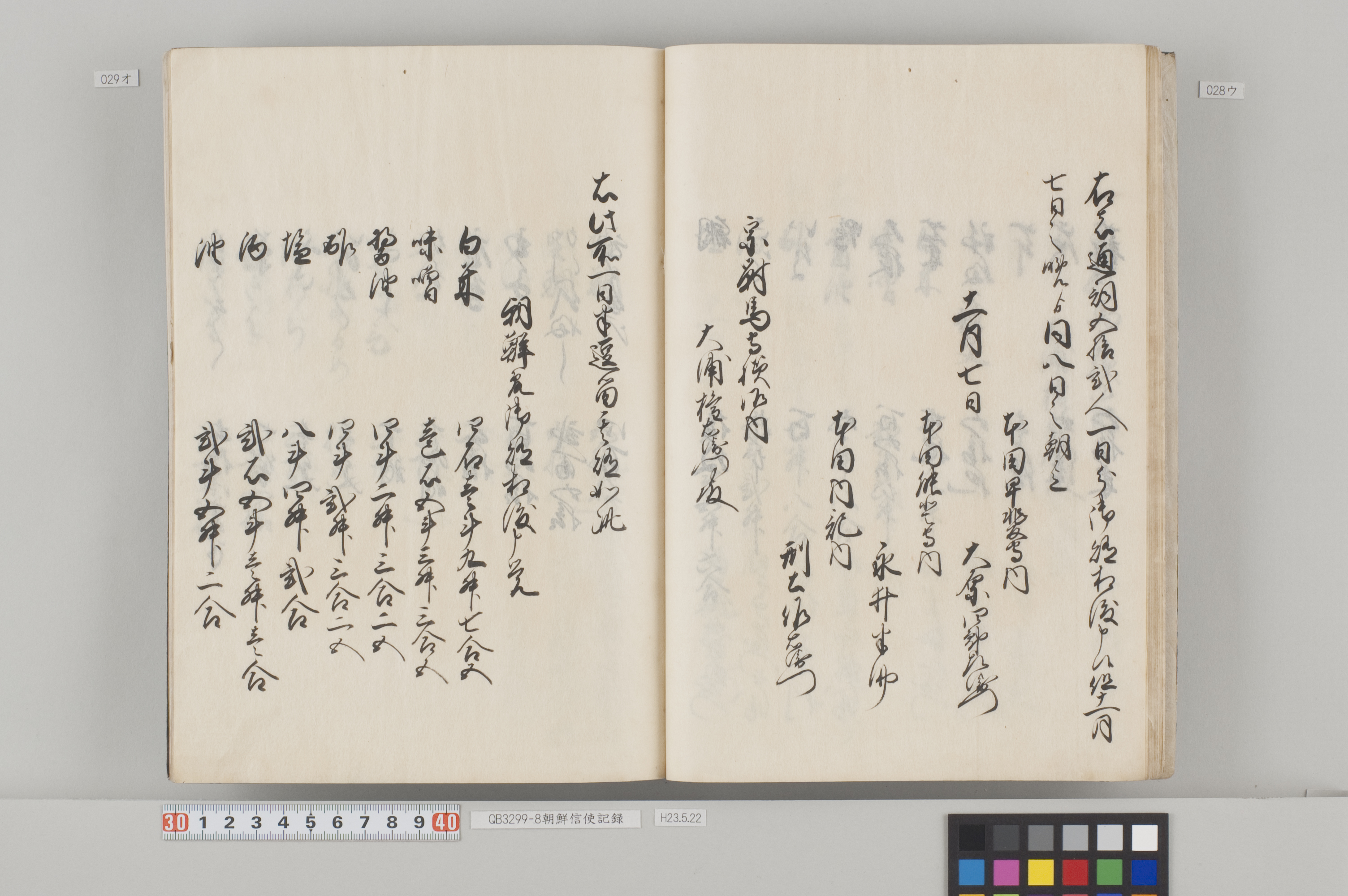 題箋に「寛永丙子信使記録」と記す14巻8冊の和装本。徳川宗敬氏からの寄贈本。 対馬藩主の宗義成を法名「光雲院」で呼んでいることから、彼の死後(明暦3年10月26日(1657))にまとめられたと思われる。 巻一の冒頭に「朝鮮信使来聘起本」という序文を掲げ、わが国における朝鮮との交流の歴史を述べている。また、全体の内容は「朝鮮通信使の記録」というよりも、寛永8年(1631)2月から同14年2月までの「対馬藩の朝鮮国関係記録」と言った方がふさわしい。 寛永13年度の朝鮮通信使に関する詳細な記録がなされているのはもちろん、対馬藩家老の柳川調興が国書改竄等を幕府に訴え関係者が処罰された事件(柳川一件)や、柳川一件の際に対馬で行われた幕府の調査の内容、徳川家光の所望により朝鮮国から来日した馬上才(曲馬)の上覧についても事細かに記述されている。 なお、七巻に「寛永十二年」と書かれているが「寛永十一年」の誤記である。