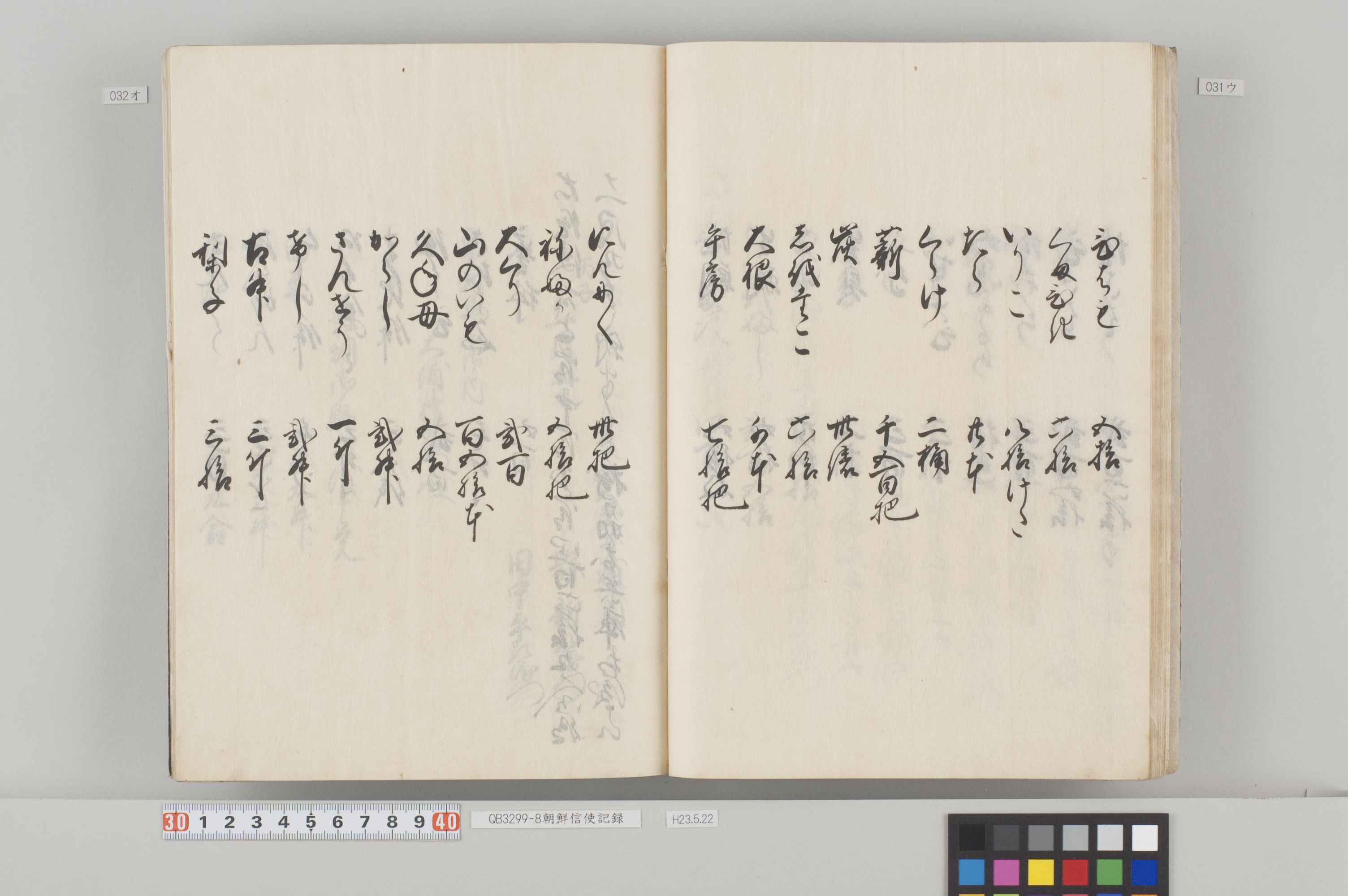 題箋に「寛永丙子信使記録」と記す14巻8冊の和装本。徳川宗敬氏からの寄贈本。 対馬藩主の宗義成を法名「光雲院」で呼んでいることから、彼の死後(明暦3年10月26日(1657))にまとめられたと思われる。 巻一の冒頭に「朝鮮信使来聘起本」という序文を掲げ、わが国における朝鮮との交流の歴史を述べている。また、全体の内容は「朝鮮通信使の記録」というよりも、寛永8年(1631)2月から同14年2月までの「対馬藩の朝鮮国関係記録」と言った方がふさわしい。 寛永13年度の朝鮮通信使に関する詳細な記録がなされているのはもちろん、対馬藩家老の柳川調興が国書改竄等を幕府に訴え関係者が処罰された事件(柳川一件)や、柳川一件の際に対馬で行われた幕府の調査の内容、徳川家光の所望により朝鮮国から来日した馬上才(曲馬)の上覧についても事細かに記述されている。 なお、七巻に「寛永十二年」と書かれているが「寛永十一年」の誤記である。