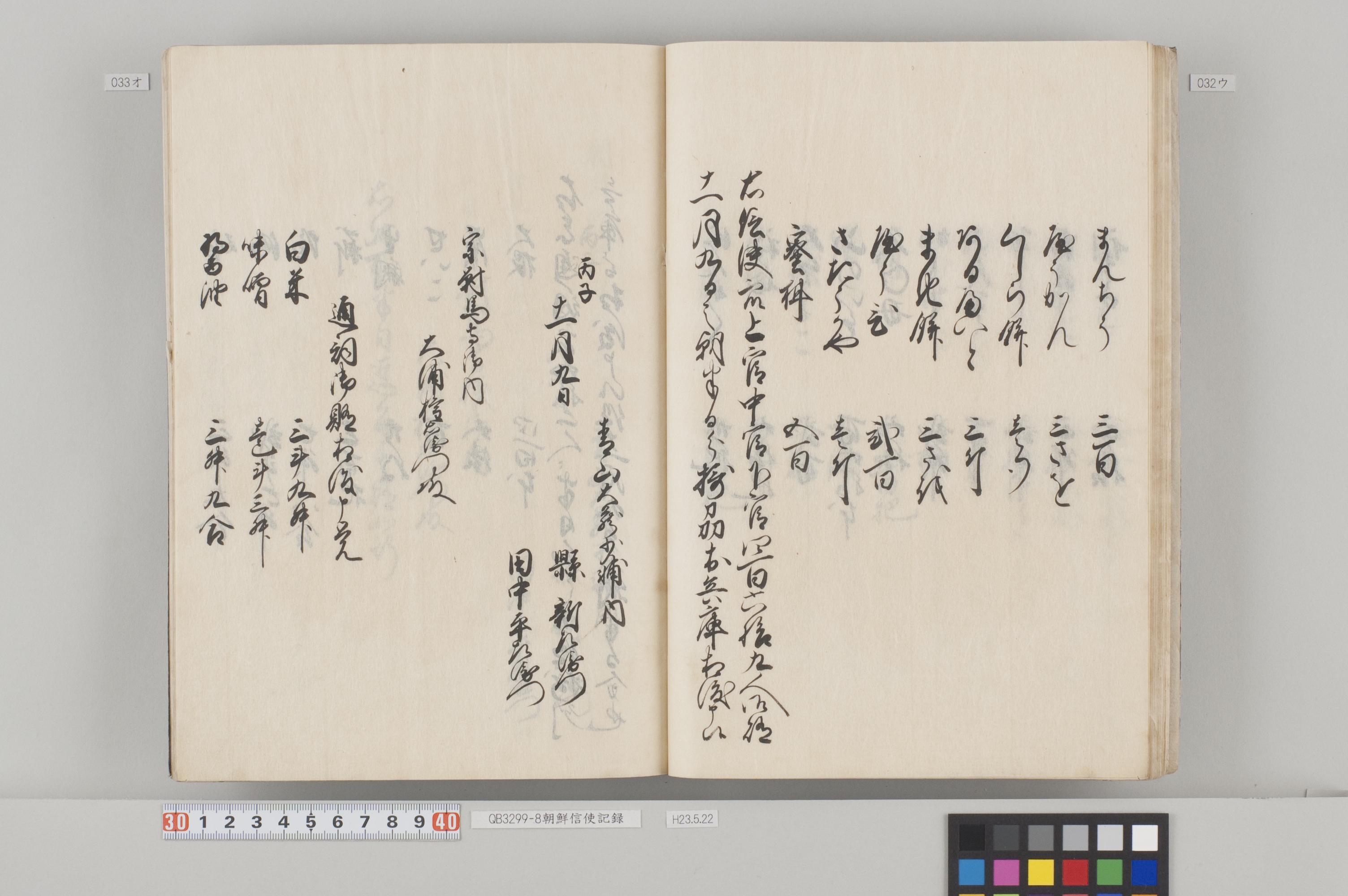 題箋に「寛永丙子信使記録」と記す14巻8冊の和装本。徳川宗敬氏からの寄贈本。 対馬藩主の宗義成を法名「光雲院」で呼んでいることから、彼の死後(明暦3年10月26日(1657))にまとめられたと思われる。 巻一の冒頭に「朝鮮信使来聘起本」という序文を掲げ、わが国における朝鮮との交流の歴史を述べている。また、全体の内容は「朝鮮通信使の記録」というよりも、寛永8年(1631)2月から同14年2月までの「対馬藩の朝鮮国関係記録」と言った方がふさわしい。 寛永13年度の朝鮮通信使に関する詳細な記録がなされているのはもちろん、対馬藩家老の柳川調興が国書改竄等を幕府に訴え関係者が処罰された事件(柳川一件)や、柳川一件の際に対馬で行われた幕府の調査の内容、徳川家光の所望により朝鮮国から来日した馬上才(曲馬)の上覧についても事細かに記述されている。 なお、七巻に「寛永十二年」と書かれているが「寛永十一年」の誤記である。