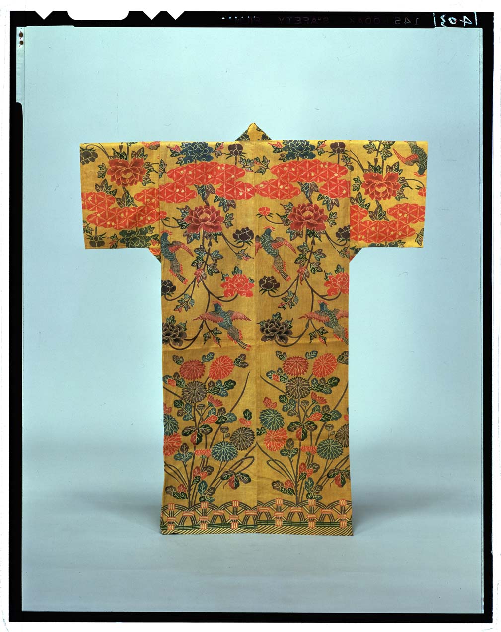 黄木綿地垣菊雲牡丹尾長鳥模様琉球紅型