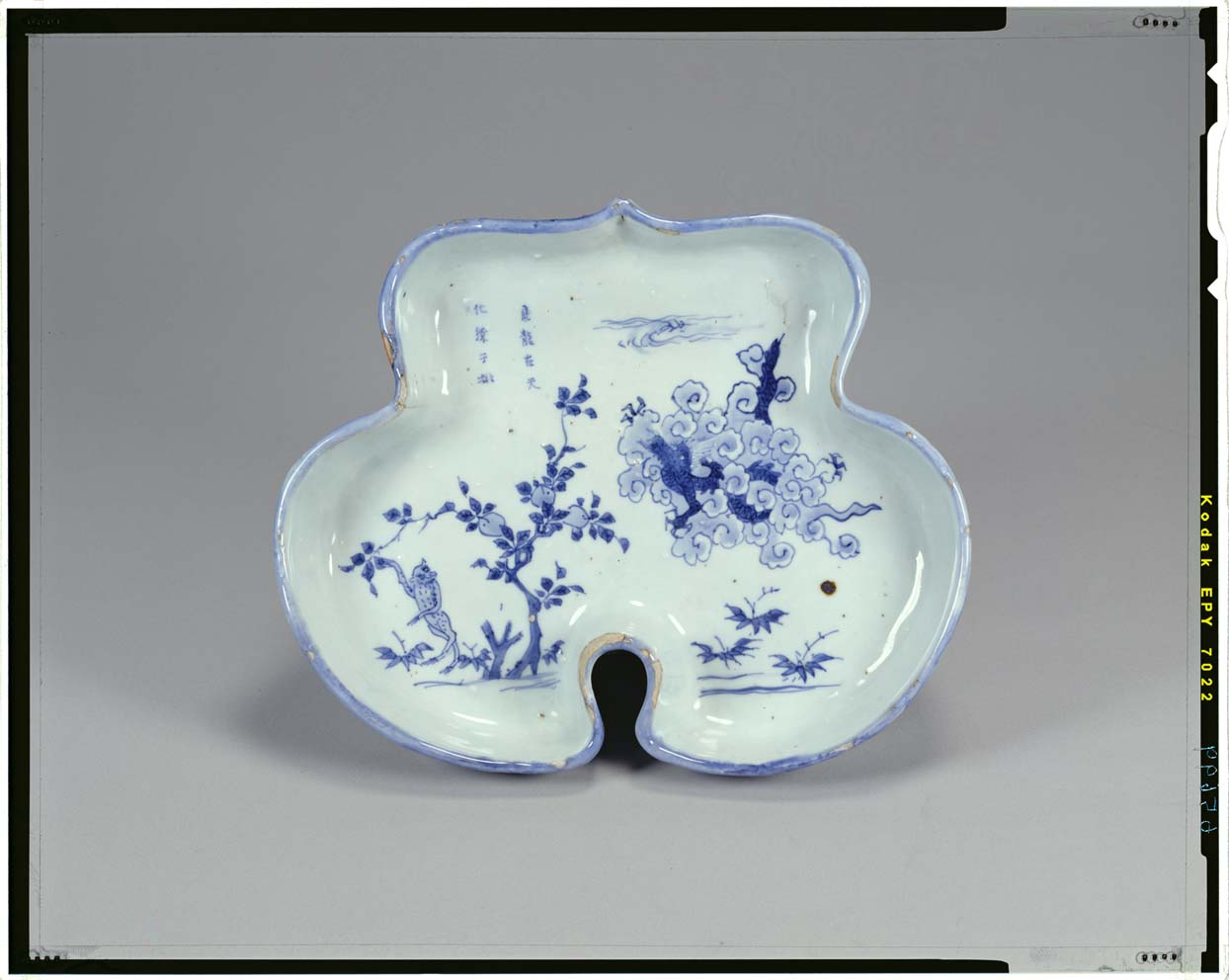 古染付桃樹雲龍文洲浜形皿/箱蓋表「□□原 南京/染付洲浜鉢壱」